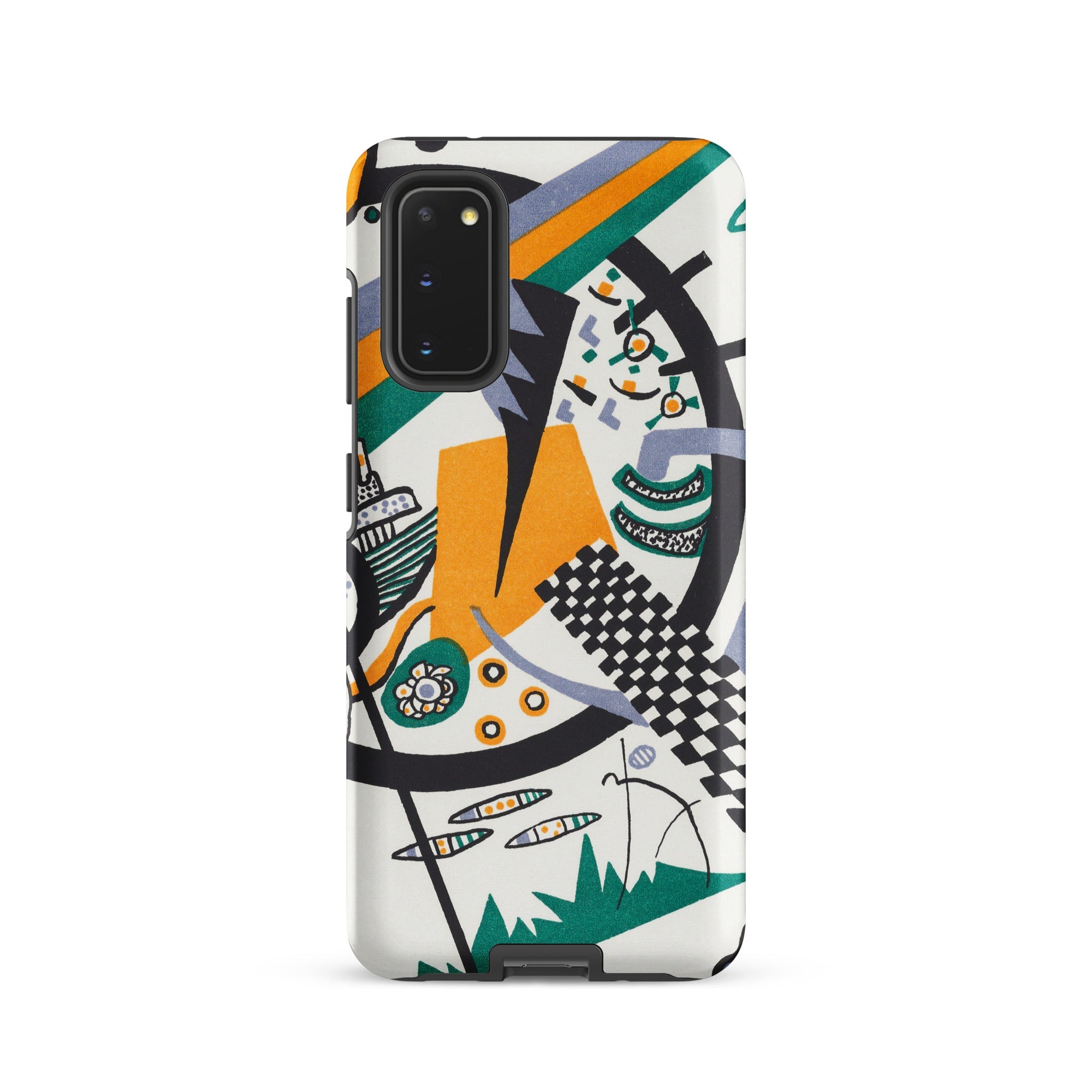 Une grille d'arcs, d'éclats et d'explosions chromatiques se déploie sur cette coque Samsung, inspirée de Small Worlds IV (1922) de Wassily Kandinsky. Des éclats d'émeraude entrent en collision avec des plans ocre, une dérive en damier interrompt le champ blanc, et de minuscules motifs orbitaux flottent comme des constellations codées.