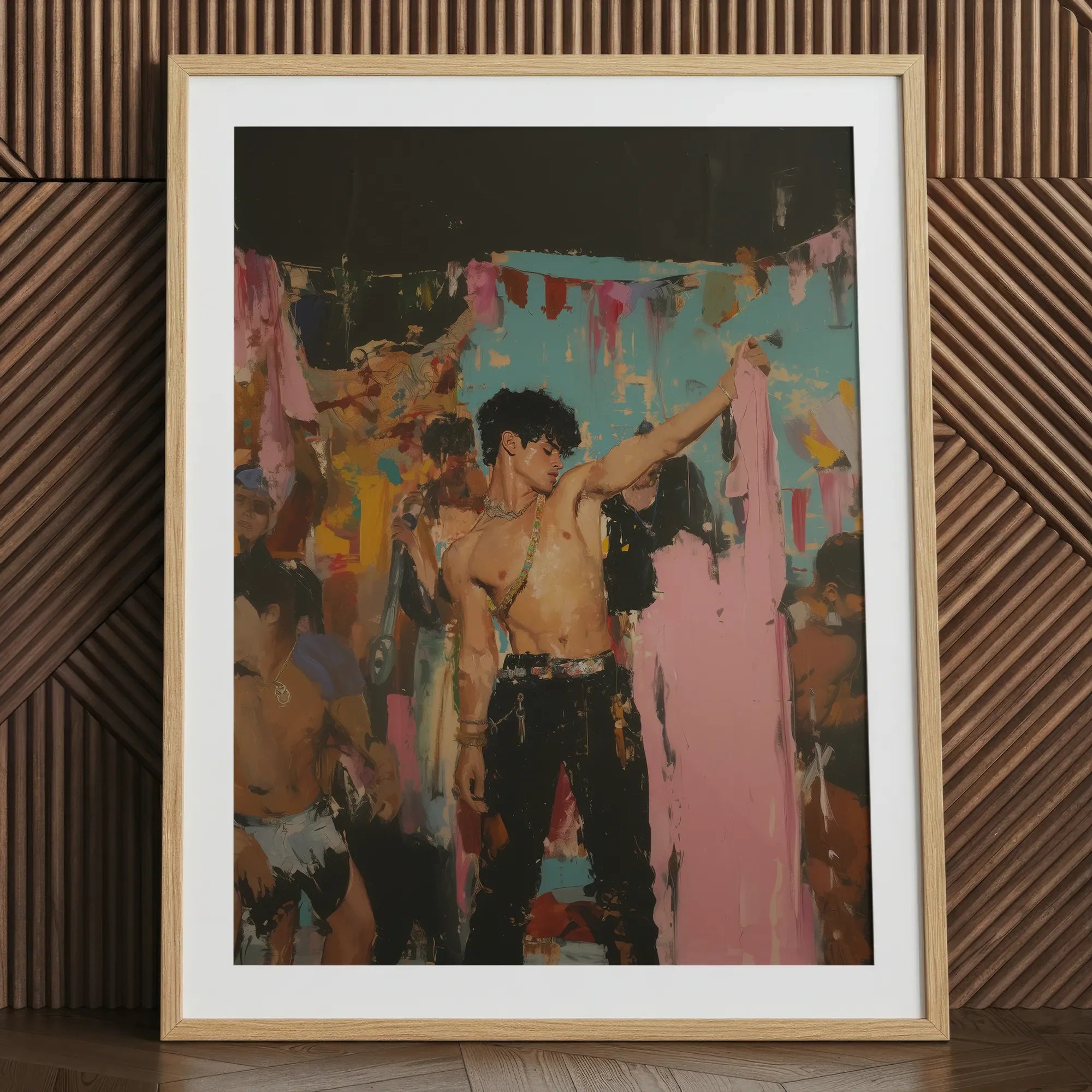 Bienvenue dans la maison des plaisirs, chéri. Où les miroirs sont tachés de rouge à lèvres et les sorties ont été remplacées par des miroirs. Il n'est pas un simple poster—il est un état souverain de l'érotisme queer, de la théologie pop-camp, de la diplomatie en latex. La centrifugeuse dans cette utopie érotique absurde—avec des jarretelles pour frontières et le rire comme loi.