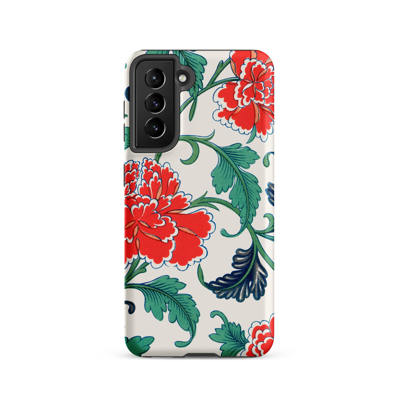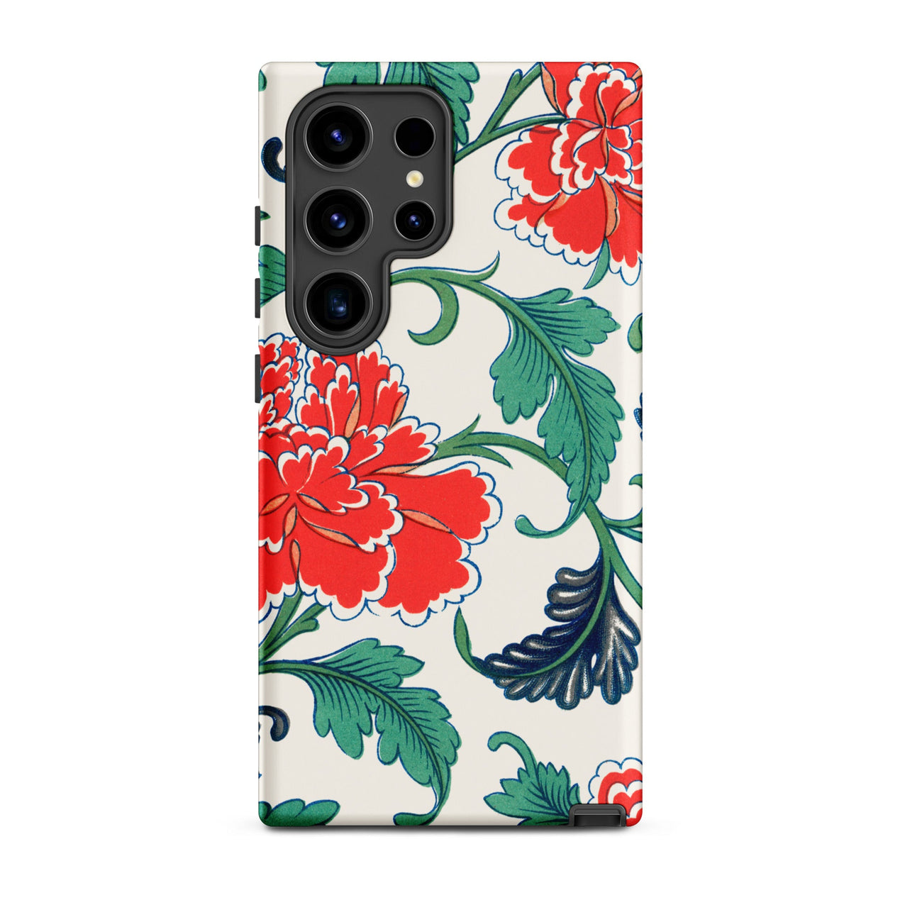 Cette coque Samsung porte l'héritage des arts décoratifs victoriens, s'inspirant de l'illustration botanique, des volutes de Chinoiserie et de la précision de la chromolithographie. Des fleurs de pivoines luxuriantes, bordées d'ivoire, s'élèvent de feuilles d'émeraude veinées de bleu nuit, évoquant les motifs textiles orientaux et la géométrie des carreaux d'Iznik.