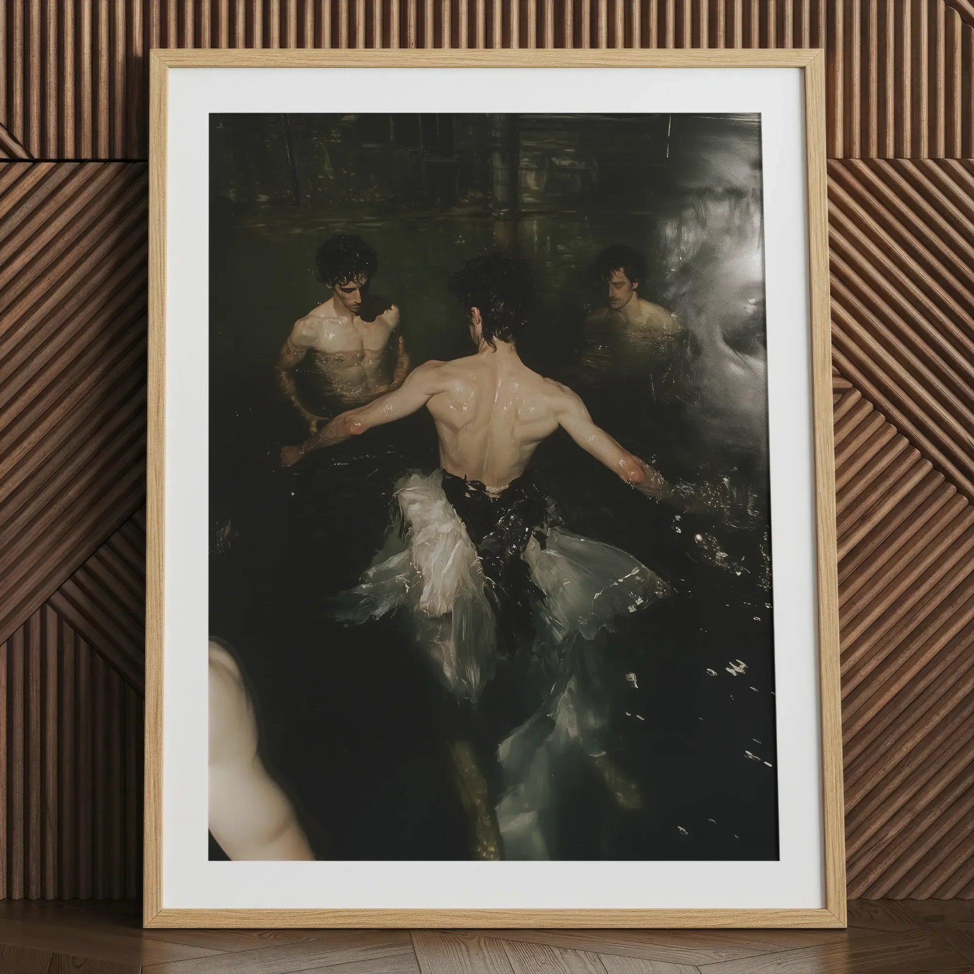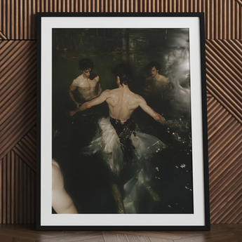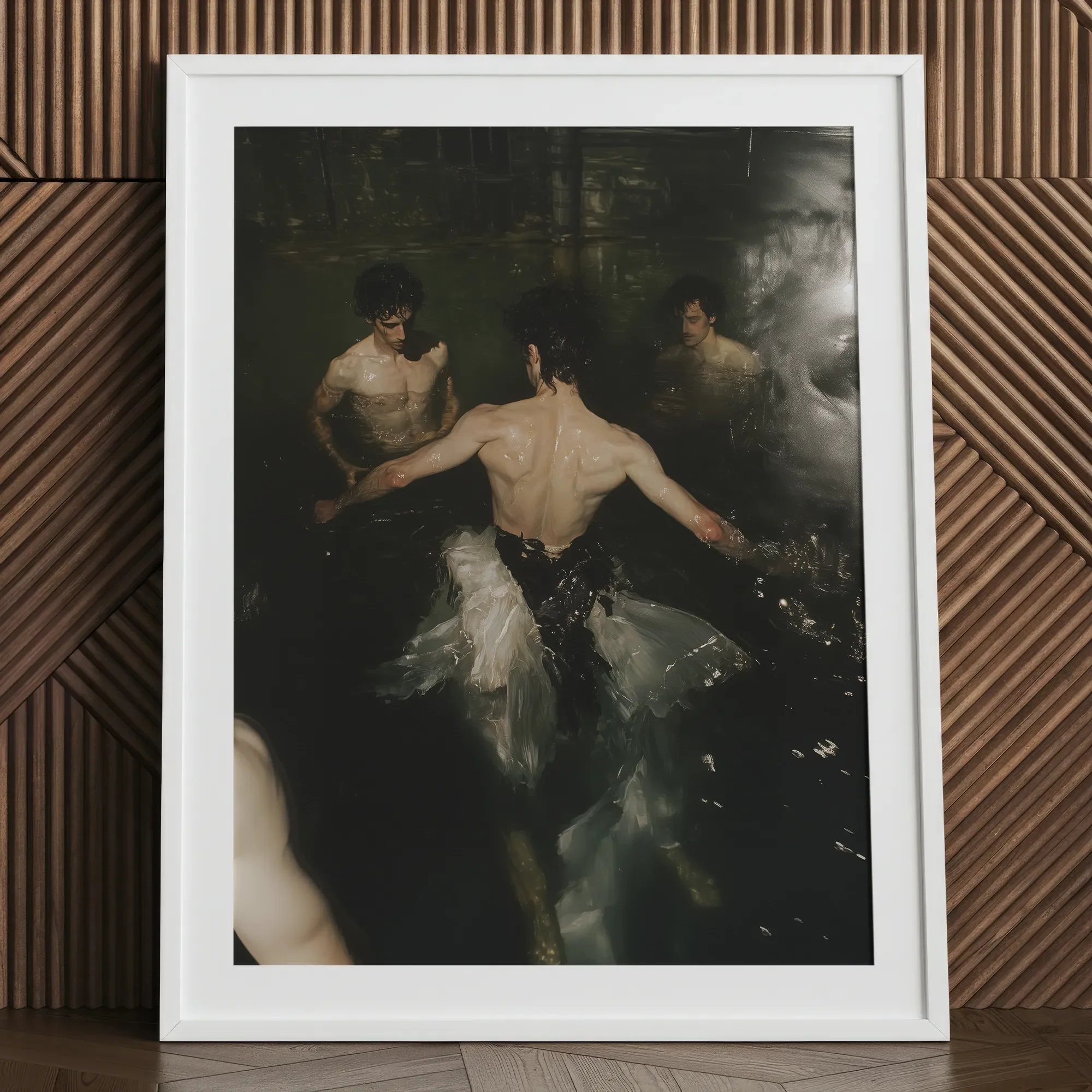 Torse nu, scintillant et huilé pour le baptême. Ballet grunge gay pris en pleine immersion, colonne vertébrale tendue, épaules illuminées comme une rébellion. Son dos laqué de chair sous une filtration mythique. Corps rétroéclairé, scintillant, devenant architecture. Crête deltoïde à creux lombaire, un psaume anatomique laqué d'huile. Mais la peau ment. En dessous : tulle effiloché comme un nerf blanchi, enveloppant sa taille immergée. Cygne à moitié mort. Marin à moitié ruiné. Le tissu flotte contre le courant saumâtre, rappelant à la fois un costume de scène et des déchets de rivage.