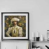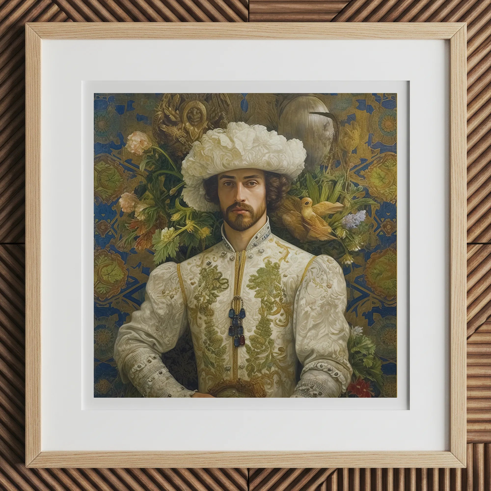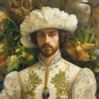 Un chapeau à plumes de perles repose sur des boucles sombres balayées par le vent. Sa barbe est sculptée comme une relique de l'aristocratie maure, encadrant des lèvres qui ont murmuré des sonnets dans des alcôves faiblement éclairées où résonnent les échos de la poésie de l'Alhambra. Le loriot doré sur son épaule est un témoignage battant du duende de son âme.