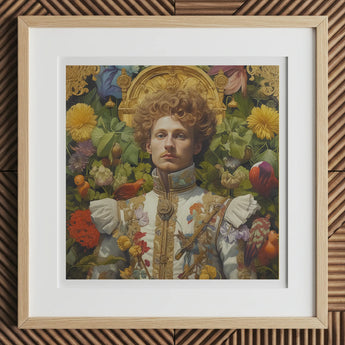 Aigu mais onirique, son regard reflète l'intimité voilée de l'aristocratie queer anglaise. Dans les couloirs silencieux des palais Tudor et les salons éclairés à la bougie de l'élite de la Régence, l'amour existait dans les regards, dans les violettes échangées comme des vœux silencieux. Derrière lui, un Éden indompté de flore britannique—roses sauvages, digitales, soucis—fleurissant comme des obsessions préraphaélites avec la beauté sauvage de la nature. Flanqués d'oiseaux surréalistes de mythe et de symbolisme royal—un rouge-gorge à poitrine cramoisie, un pinson rose Tudor—perchés dans le feuillage et chuchotant l'amour clandestin. Identités cachées tissées dans l'héraldique médiévale.