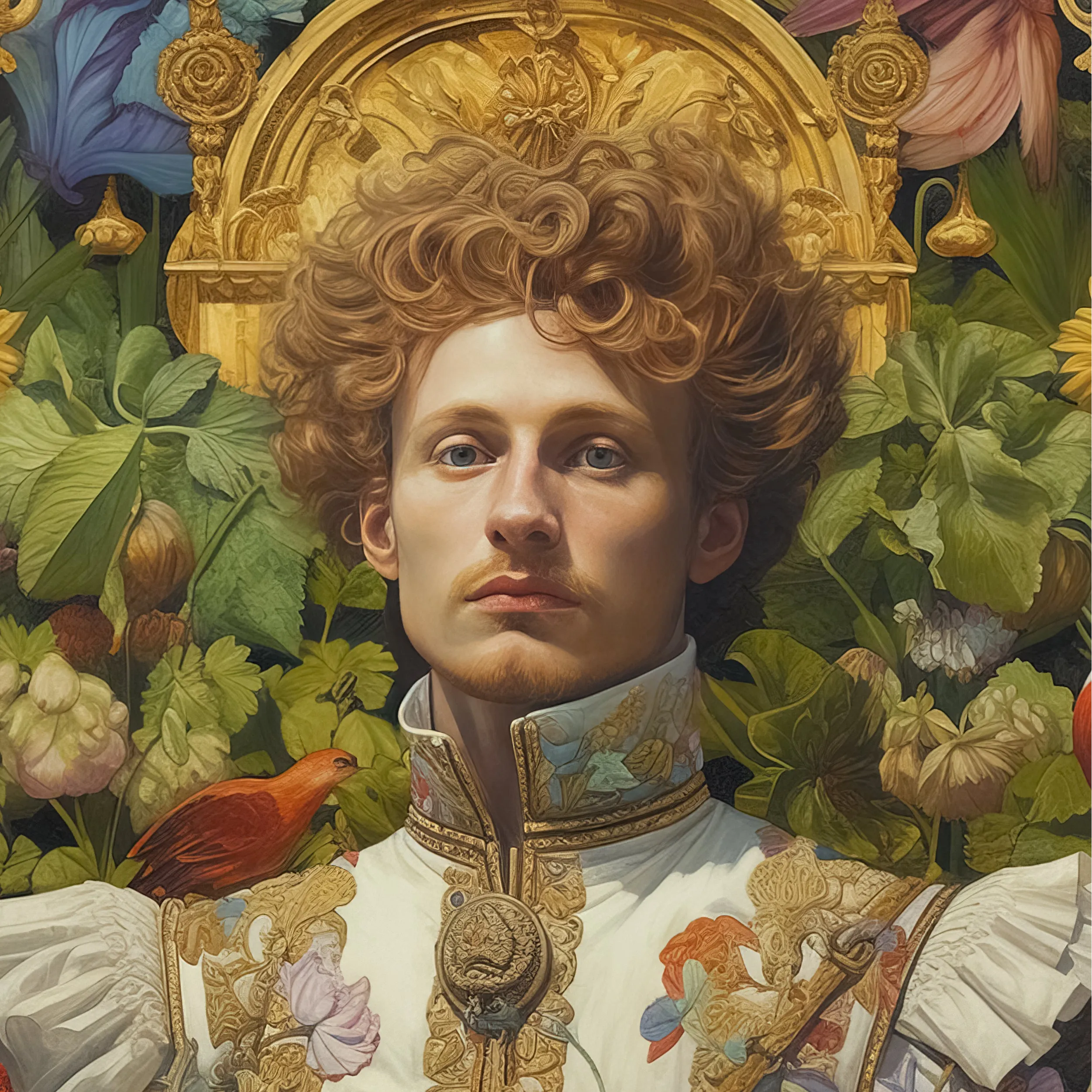 Pourtant, il y a quelque chose d'indompté ici. La profusion sauvage de la flore des jardins anglais menace de le consumer, comme si le monde naturel lui-même conspirait pour retrouver ses princes perdus et singuliers. Ses boucles auburn suggèrent un martyre non pas du corps, mais de l'identité—un saint de défi soyeux, canonisé dans le velours et la rébellion, couronné par une arche dorée ornée évoquant les autels des chapelles baroques.