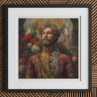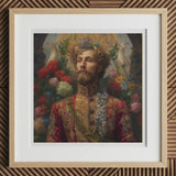 Sa couronne n'est pas de fer, mais une couronne de fleurs des prés slaves, un clin d'œil au symbolisme queer pré-soviétique, où les codes floraux portaient des messages entre poètes gays, écrivains exilés et amants cachés. Au-dessus de lui, des colombes blanches abstraites planent en témoins silencieux—messagers célestes du destin dans le folklore russe, rappelant les mythiques oiseaux de feu des contes de fées de Pouchkine.