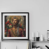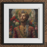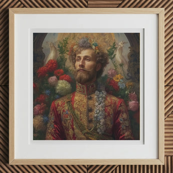 Enveloppé dans une broderie dorée et des motifs floraux resplendissants de l'ère Romanov, le Prince Fyodor se dresse comme un témoignage lumineux de la royauté russe gay—une beauté majestueuse à la fois royale et révolutionnaire. Sa veste militaire baroque, tissée de fil d'or zarafshan, rappelle la mode de la cour impériale russe, mais ses ornements subvertissent la tradition—une cascade de fleurs sauvages remplaçant les médailles de guerre, un hymne silencieux à l'amour interdit dans la Russie tsariste.