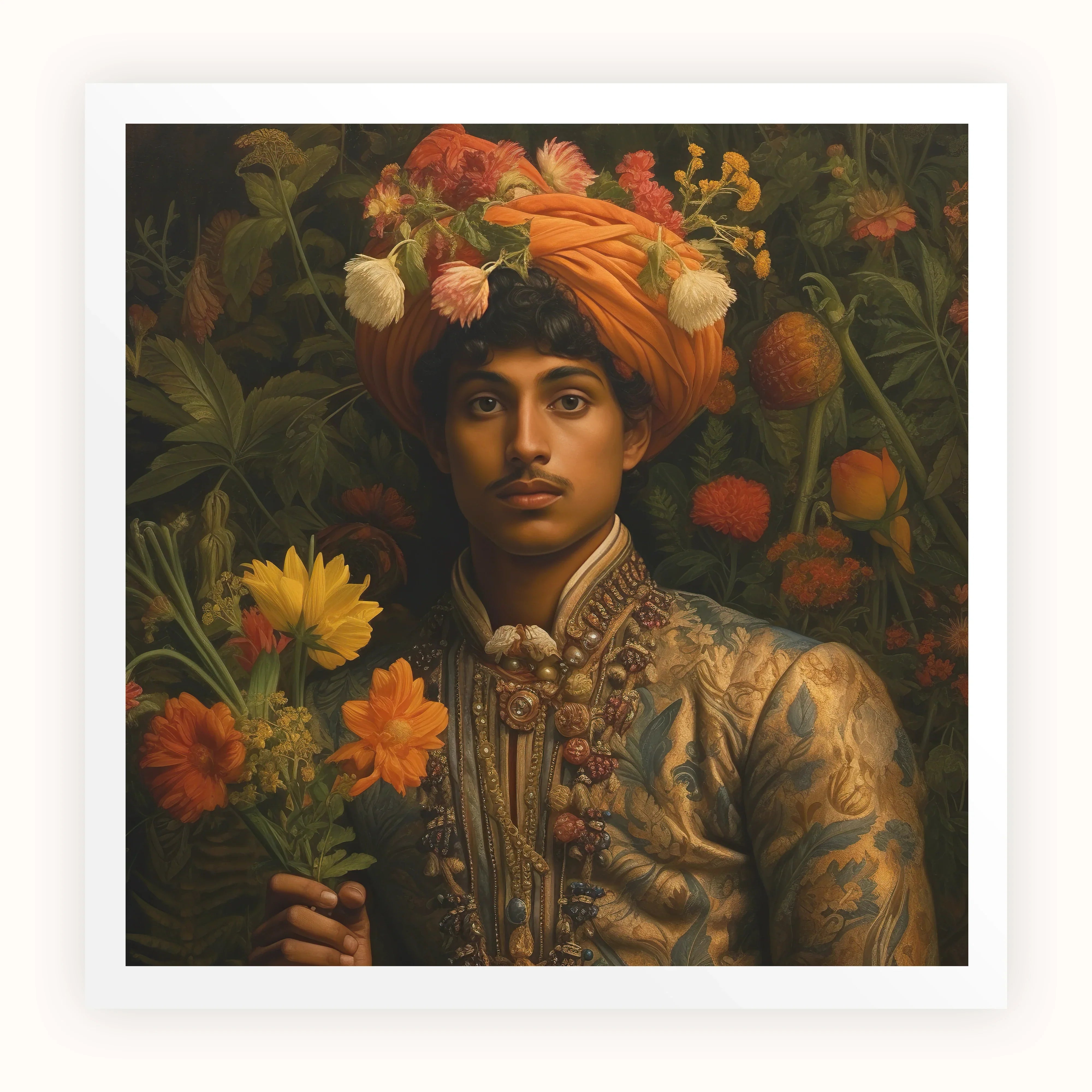Son turban safran, enflammé de zinnias, reflète la splendeur d'un Maharaja indien dans une lumière volée de Rembrandt. Autour de sa gorge, des rangées de perles Basra et de grenats—échos de la décadence nawabi, de courtisans dont le rire dansait autrefois à travers des havelis ornés de pietra dura. La broderie florale sur son angarkha royal murmure une influence persane, une tradition séculaire où la masculinité n'était jamais en contradiction avec la beauté, et l'amour était écrit en vers ourdous sur des soies parfumées.