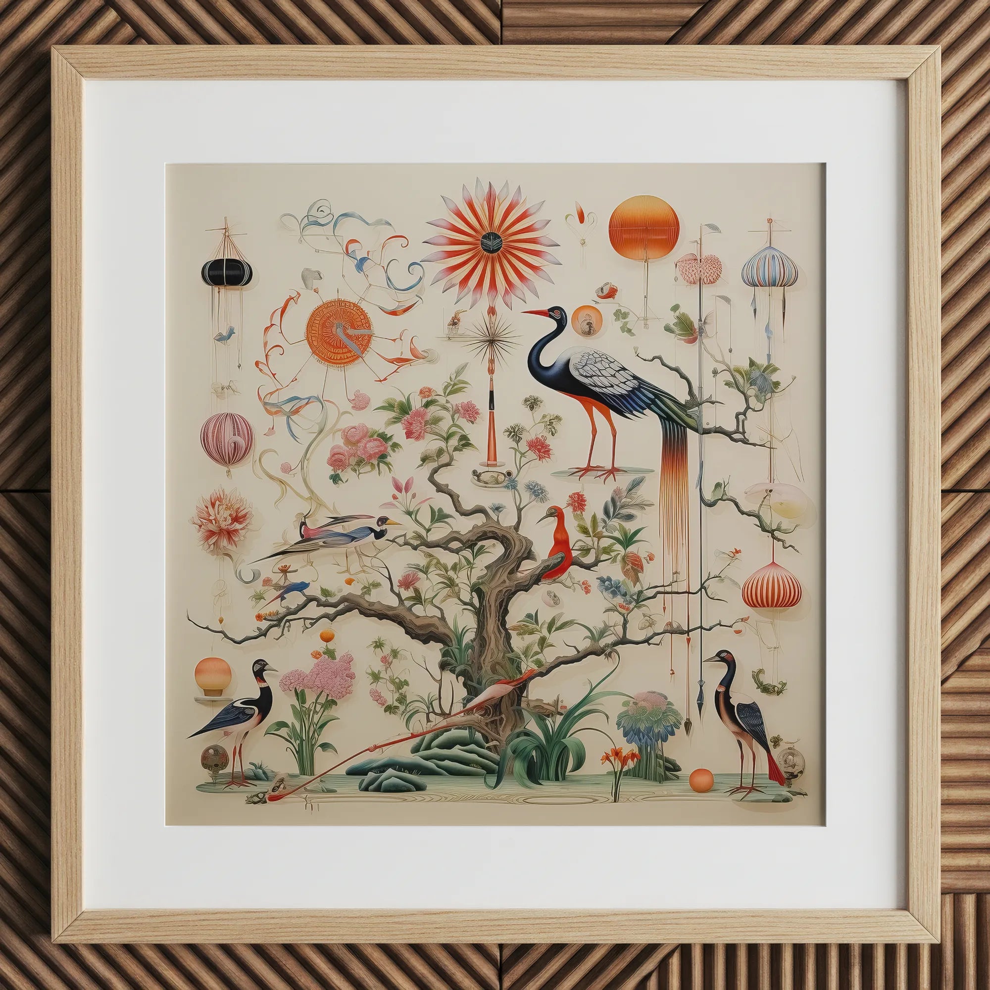 Cette composition exquise se concentre sur un arbre noueux grouillant d'exotique Avian La vie, entourée d'une fantasmagorie de lanternes flottantes, de fleurs vibrantes et d'orbes célestes. La maîtrise de la couleur de l'artiste est évidente dans le mélange harmonieux de roses coralliens, de bleus profonds et d'oranges lumineuses sur une toile de fond neutre. Chaque élément, des cuissardes à longues pattes aux motifs floraux complexes, est rendu avec des détails méticuleux, invitant une contemplation prolongée.