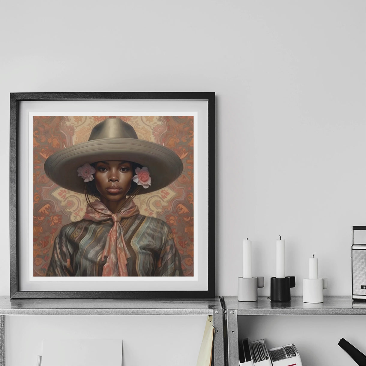 Le papier peint derrière elle ne fait pas que l'encadrer—il vibre, vivant avec une filigrane mauresque, un clin d'œil aux racines ibériques de la tradition vaquero qui a façonné l'Ouest autant que n'importe quelle histoire de pistolero. Le passé ne possède pas Sadie; elle y marche, à travers, au-delà, réécrivant ce qui a été volé, revendiquant ce qui a été refusé. Aucun chant folklorique, aucun manuel, aucun daguerréotype fané ne dictera sa place. Elle n'est pas une relique. Elle est la cavalière, l'architecte, la tempête indomptée.
