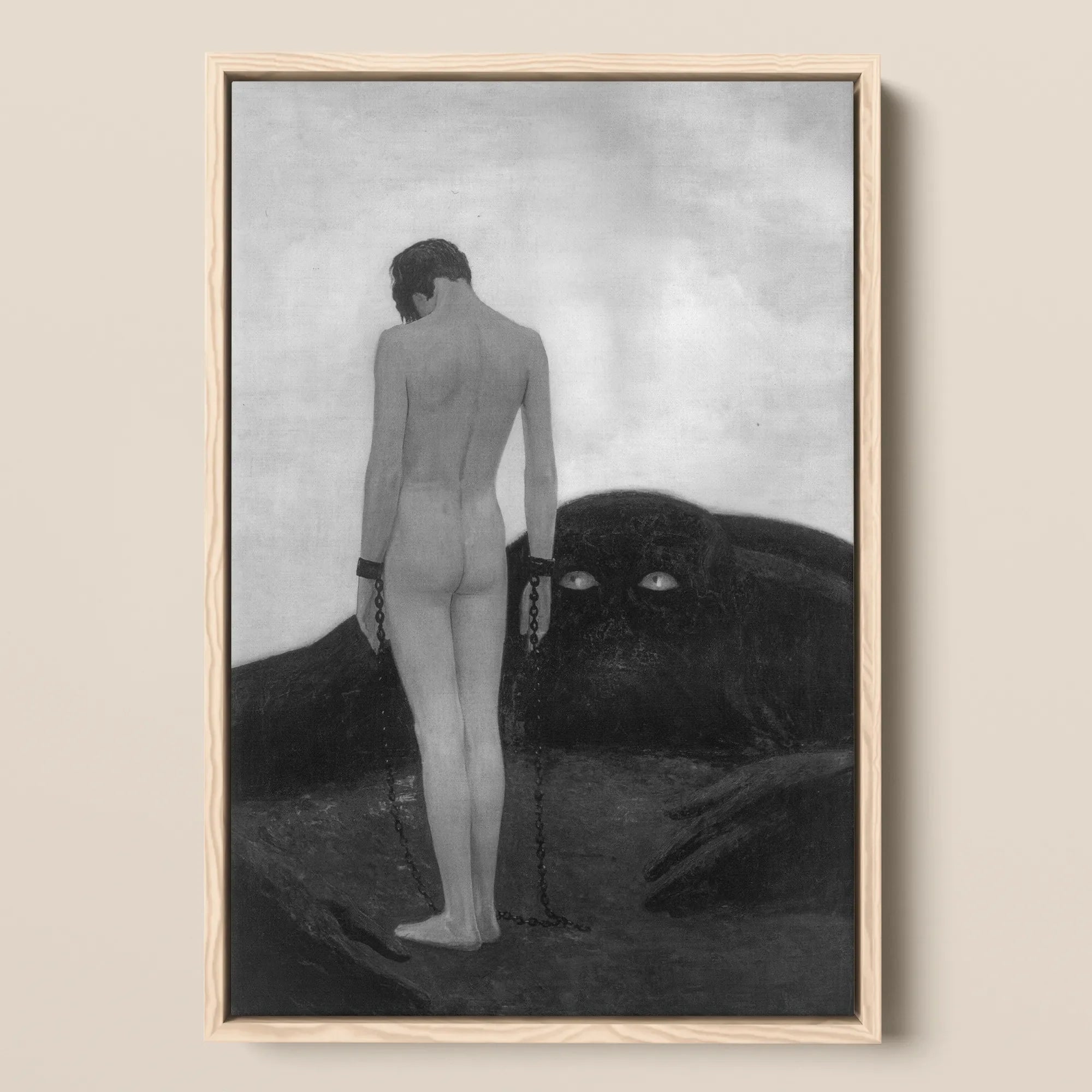 Le Sentiment de Dépendance de Sascha Schneider confronte le désir comme emprisonnement. Une figure masculine nue—sculptée dans des tons nacrés contre un noir volcanique—se penche vers un fantôme imposant dont la forme se brouille entre muscle, brouillard et jugement.