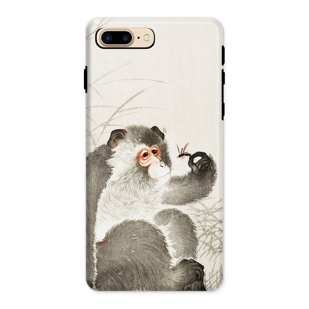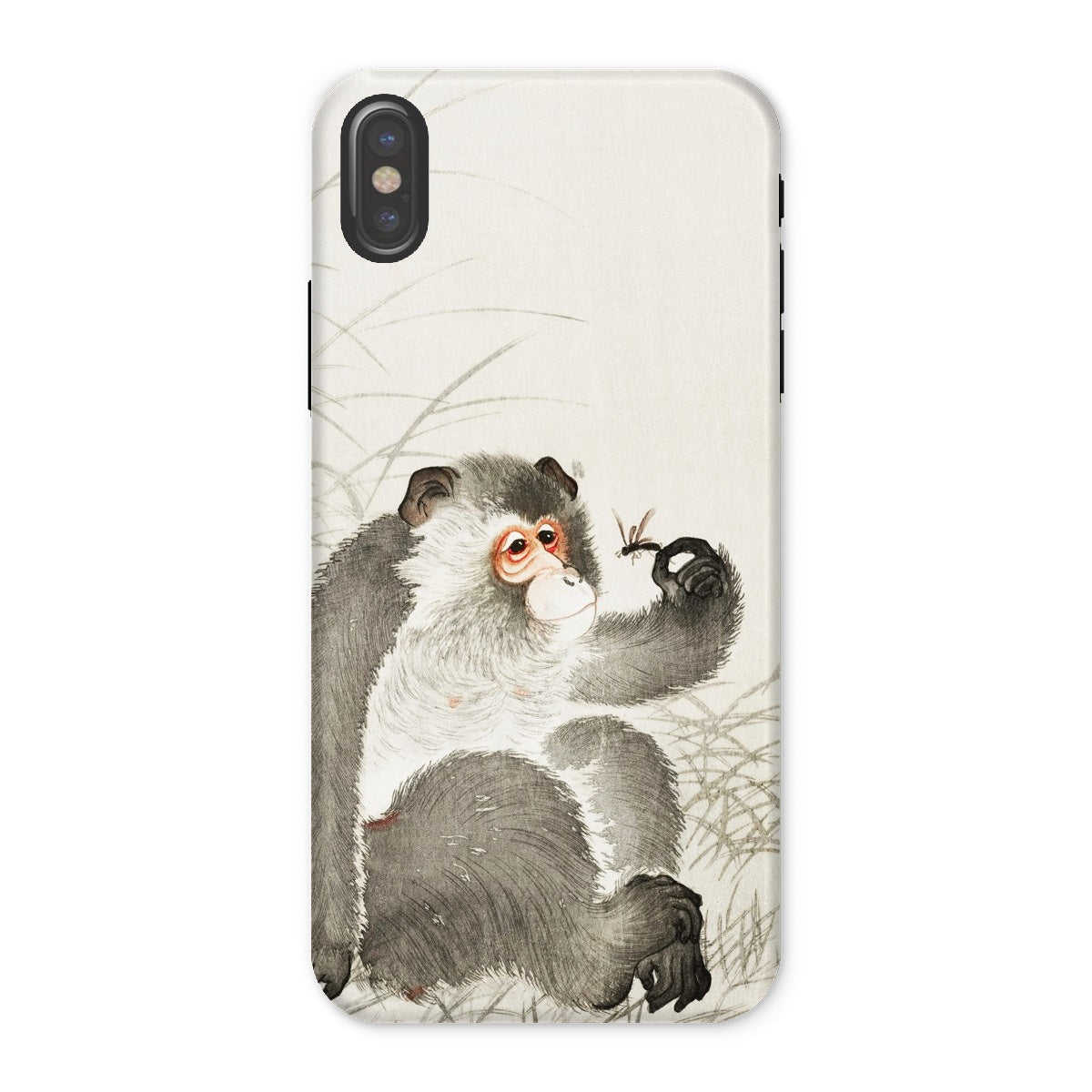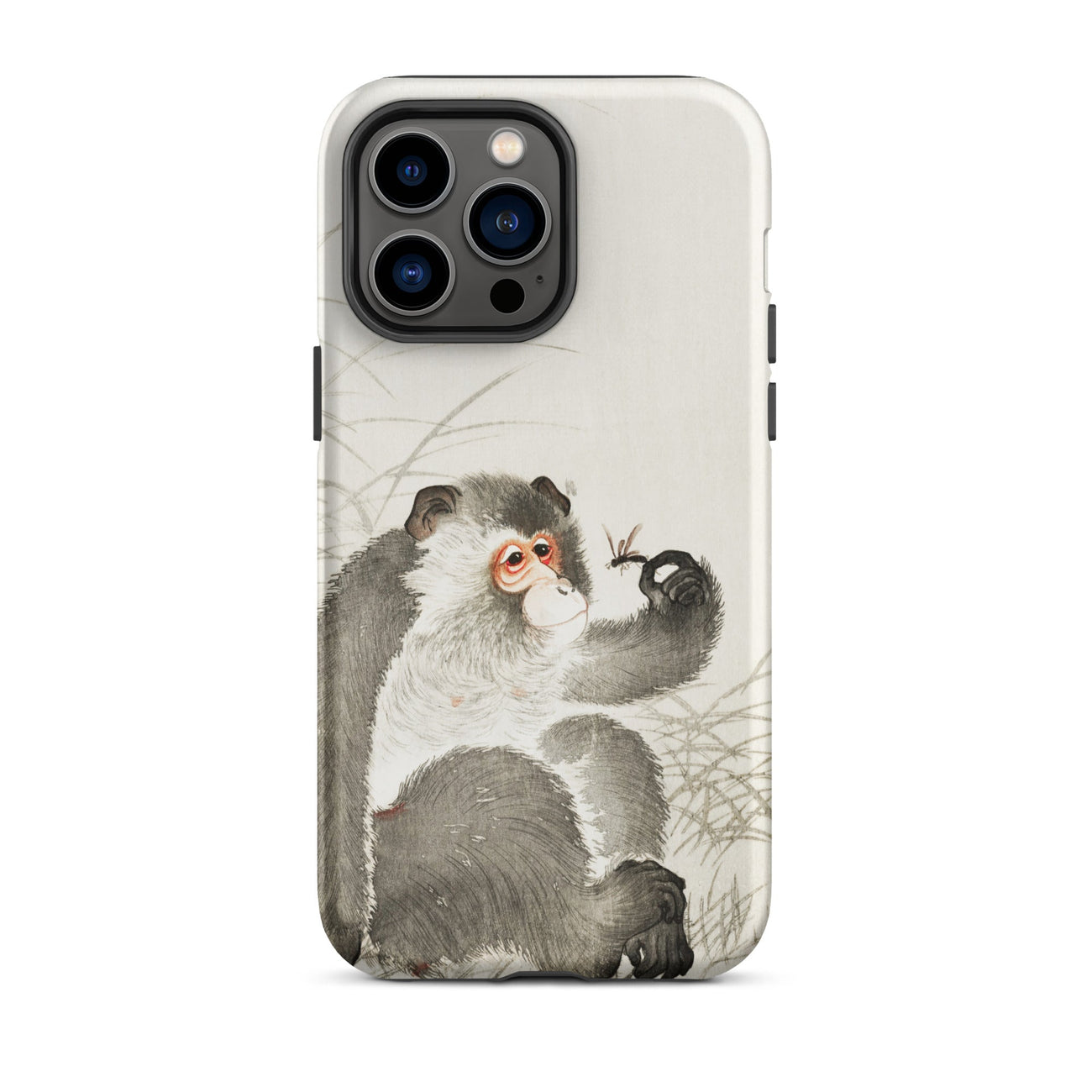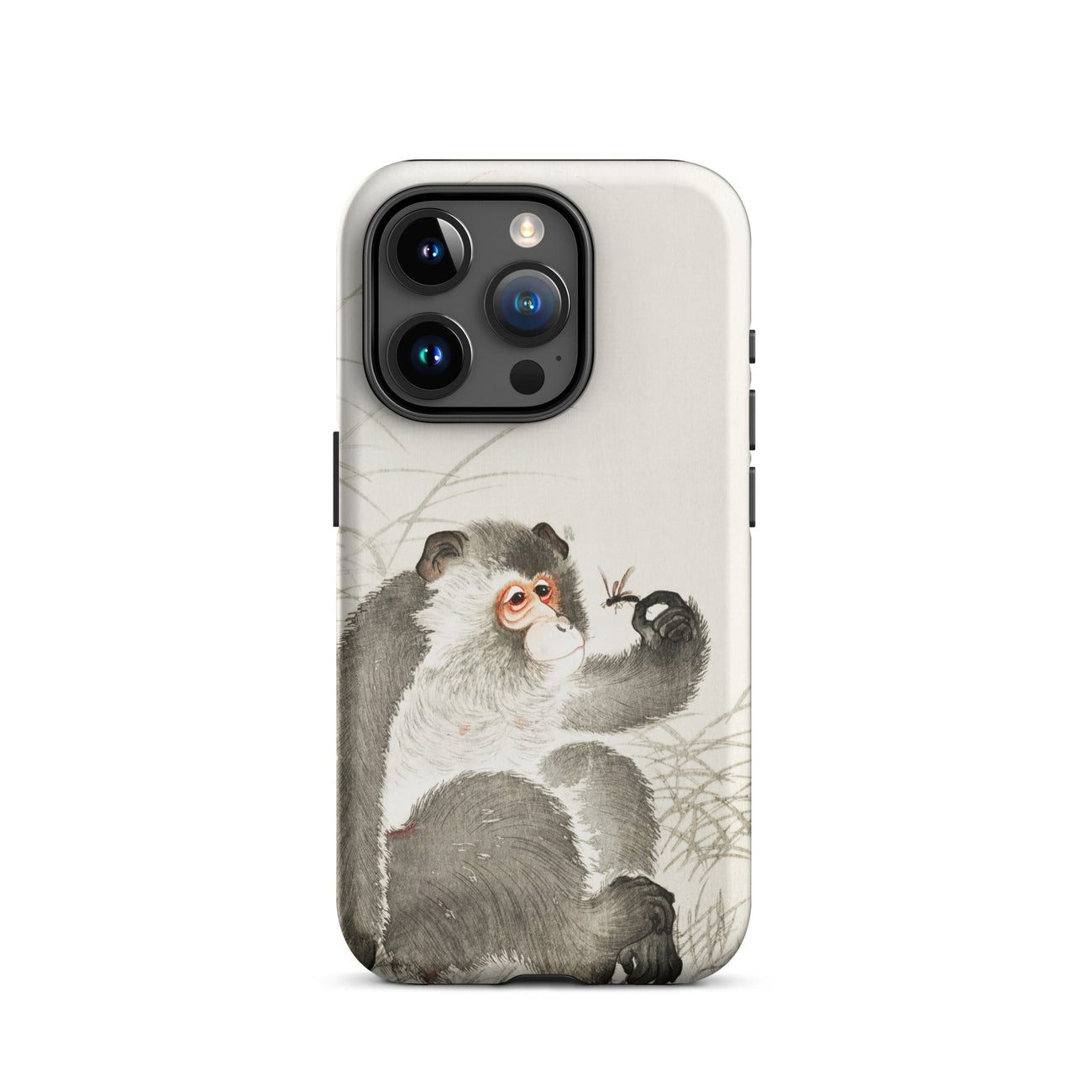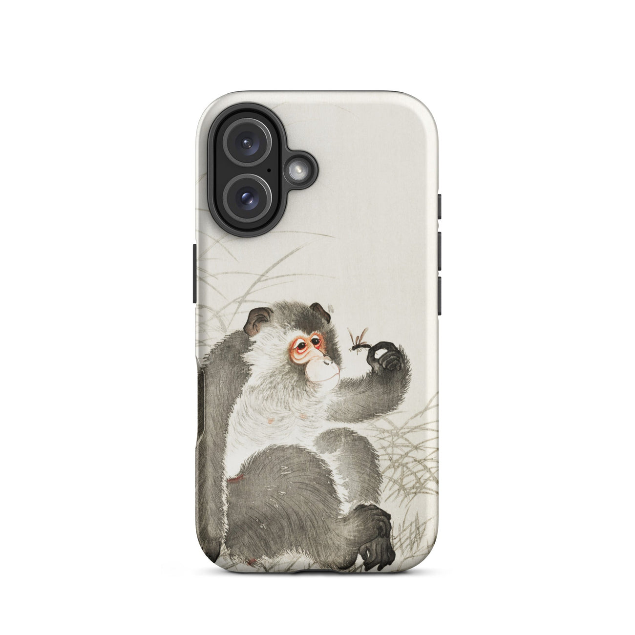 Voici une fusion fantaisiste de la nature et de la technologie prête à orner votre iPhone. Cette coque captivante présente la merveille Shin-hanga d'Ohara Koson "Singe avec Insecte", transformant votre appareil en une galerie d'art de poche. Le primate curieux, rendu dans un gris exquis, observe attentivement une délicate libellule perchée sur son doigt tendu.
