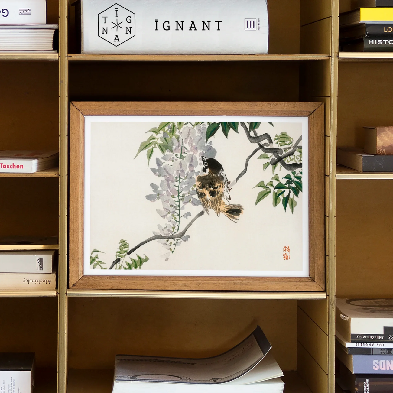 Le plumage tacheté de l'oiseau, une symphonie d'ocre et de terre de Sienne, contraste magnifiquement avec les fleurs diaphanes de glycine. Les délicats pétales lavande se déversent, leurs formes légères rendues avec une finesse éthérée. Les feuilles émeraude encadrent la scène, leurs pointes aiguës guidant votre regard. La branche noueuse, un témoignage de l'art de la nature, berce à la fois l'oiseau et la fleur. Le génie kacho-e de Bairei brille dans chaque détail méticuleux - de l'œil vif du moineau à ses plumes de queue ébouriffées par le vent.