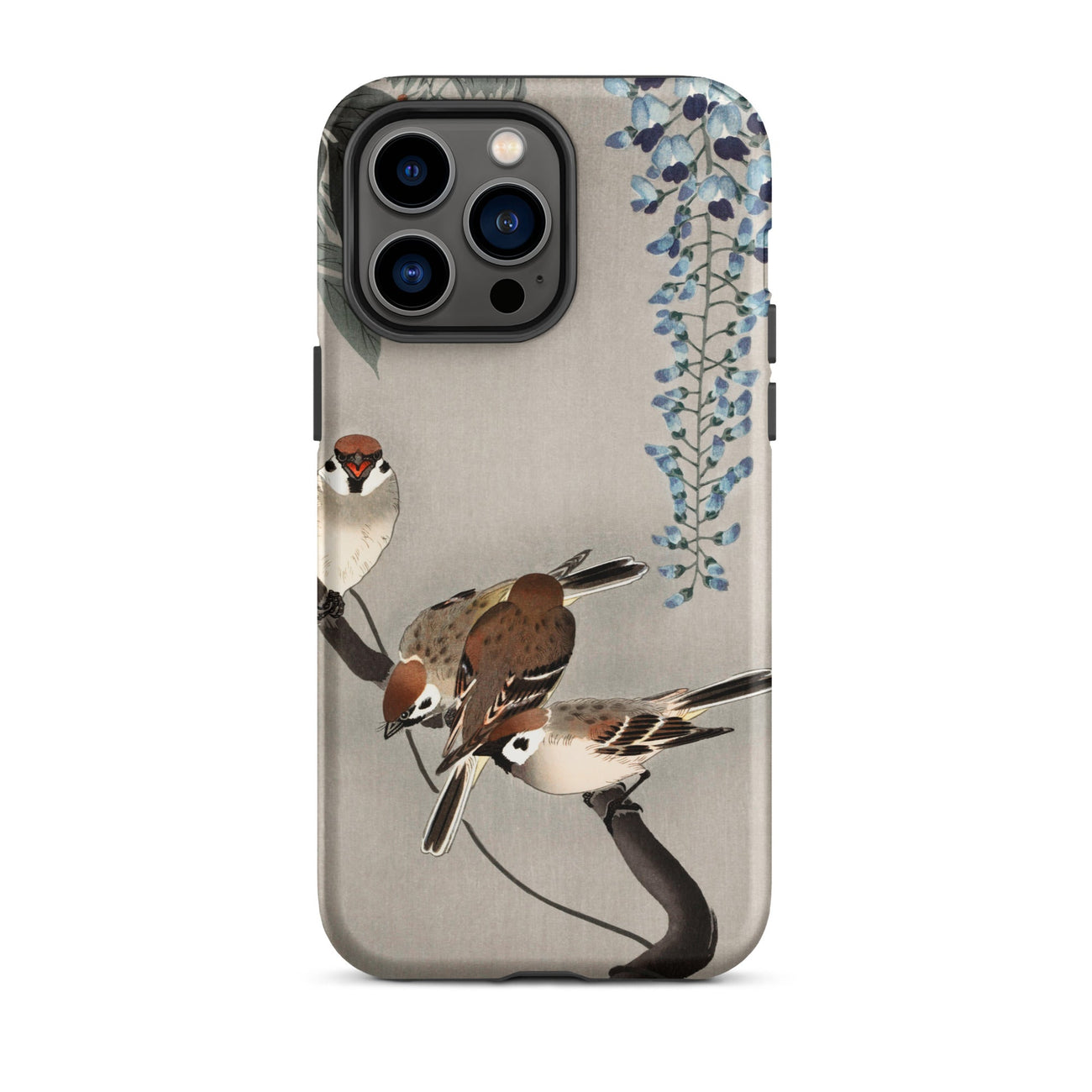 Perchez votre iPhone Dans un jardin japonais d'émerveillement avec ce cas inspiré d'Ohara Koson. Les moineaux descendent sur les branches d'encre, leurs plumes une étude en brosse délicate. Wisteria cascades en bleu éthéré, chaque pétale un murmure de maîtrise de shin-hanga.