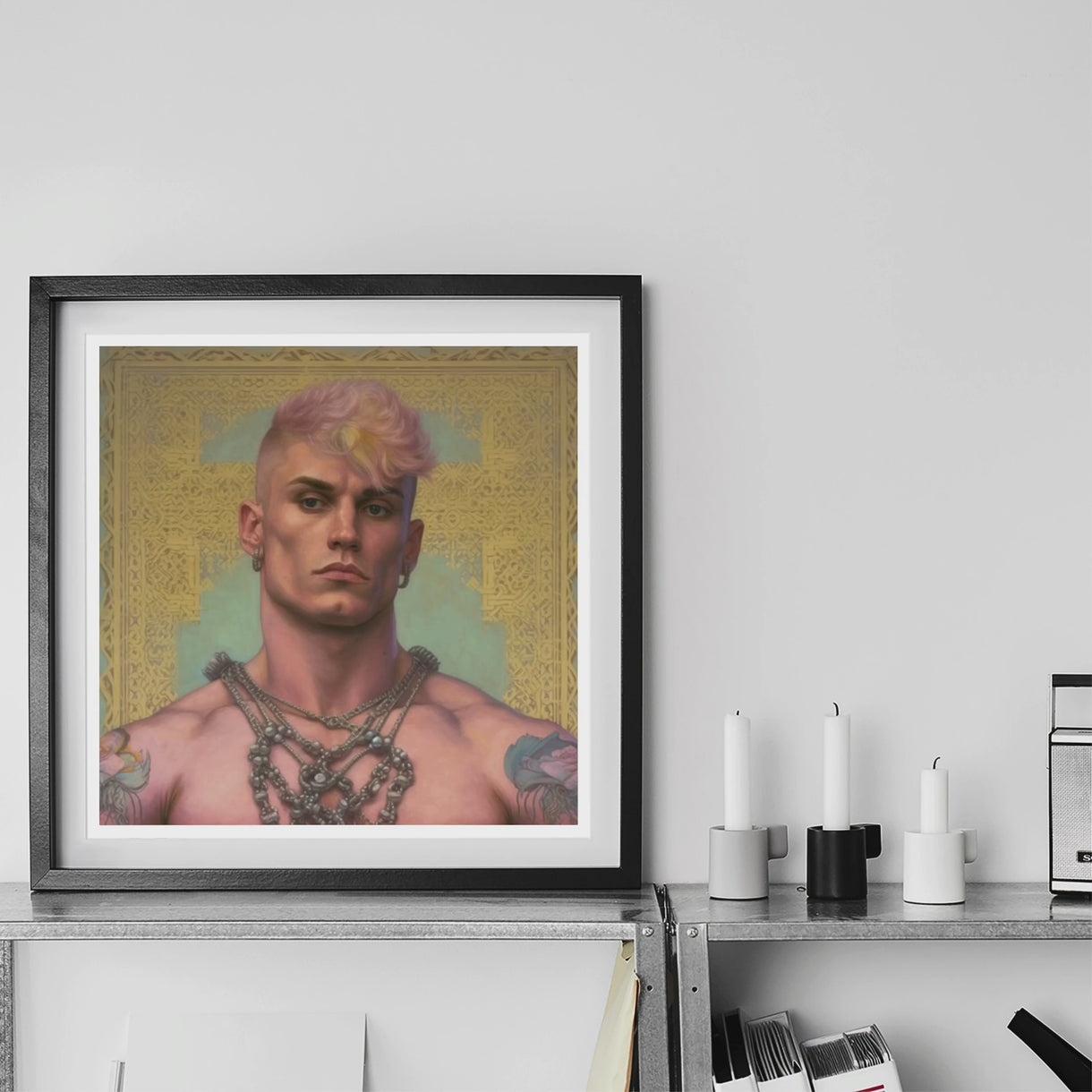 Une vision de la masculinité queer sculptée dans la lumière et l'ombre—ce jeune homme robuste existe entre deux mondes. Son regard, inébranlable mais illisible, ancre la composition, tandis que l'or doux d'une tapisserie ornée le cadre comme une relique d'un empire sans nom. Sa poitrine nue, enveloppée de chaînes épaisses et enchevêtrées, transforme un ornement de rue en quelque chose de cérémoniel, quelque chose d'ancien. Un voyou gay queercore rencontrant une renaissance de sa propre création.