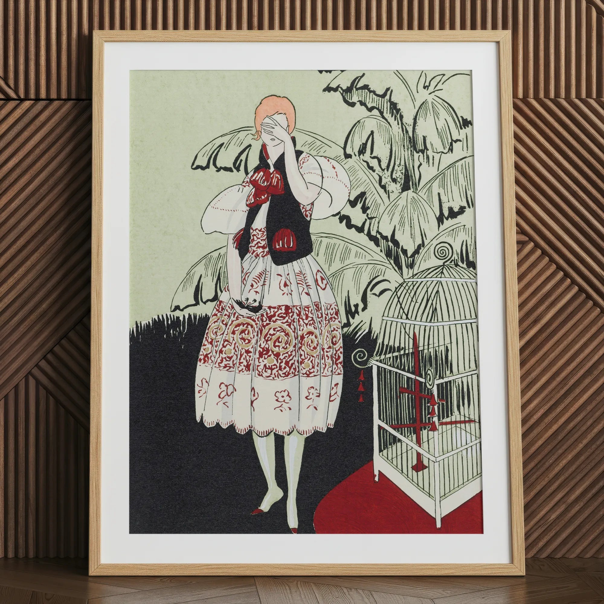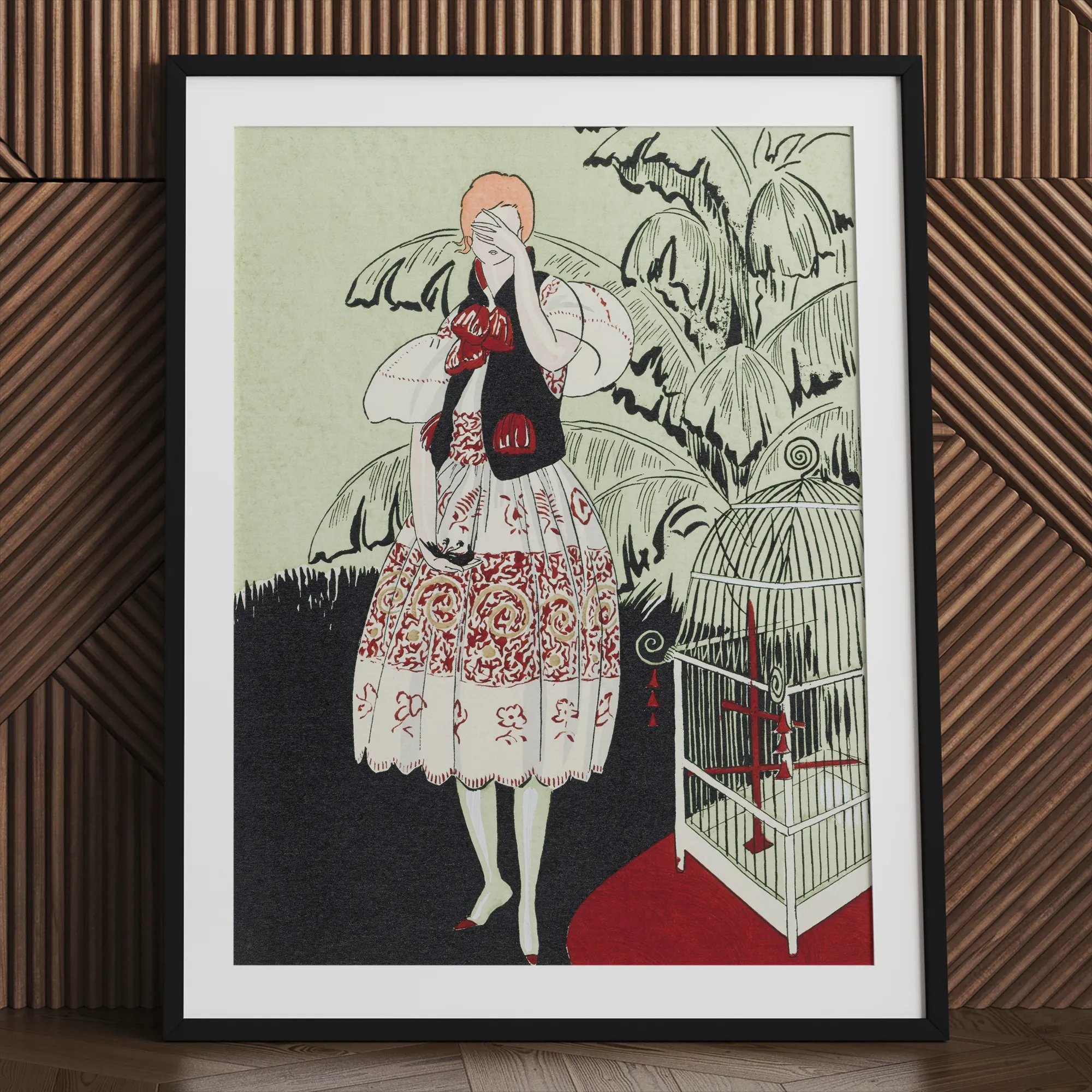 Alors que vos yeux se promènent, vous découvrirez la juxtaposition d'une cage à oiseaux blanche éclatante contre un feuillage luxuriant esquissé. La pose coquette de la figure, une main couvrant délicatement son visage, ajoute une aura de mystère qui suscitera la conversation dans votre collection d'art organisée. Cette impression en édition limitée illustre la technique pochoir laborieuse, prisée pour ses pigments vibrants et sa finition effet mouillé.