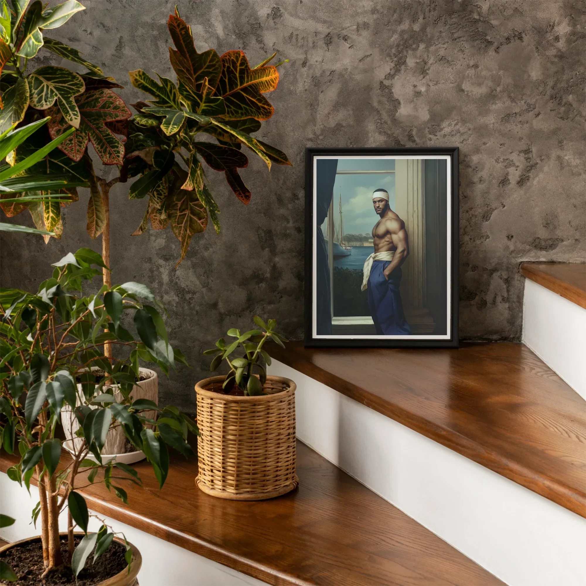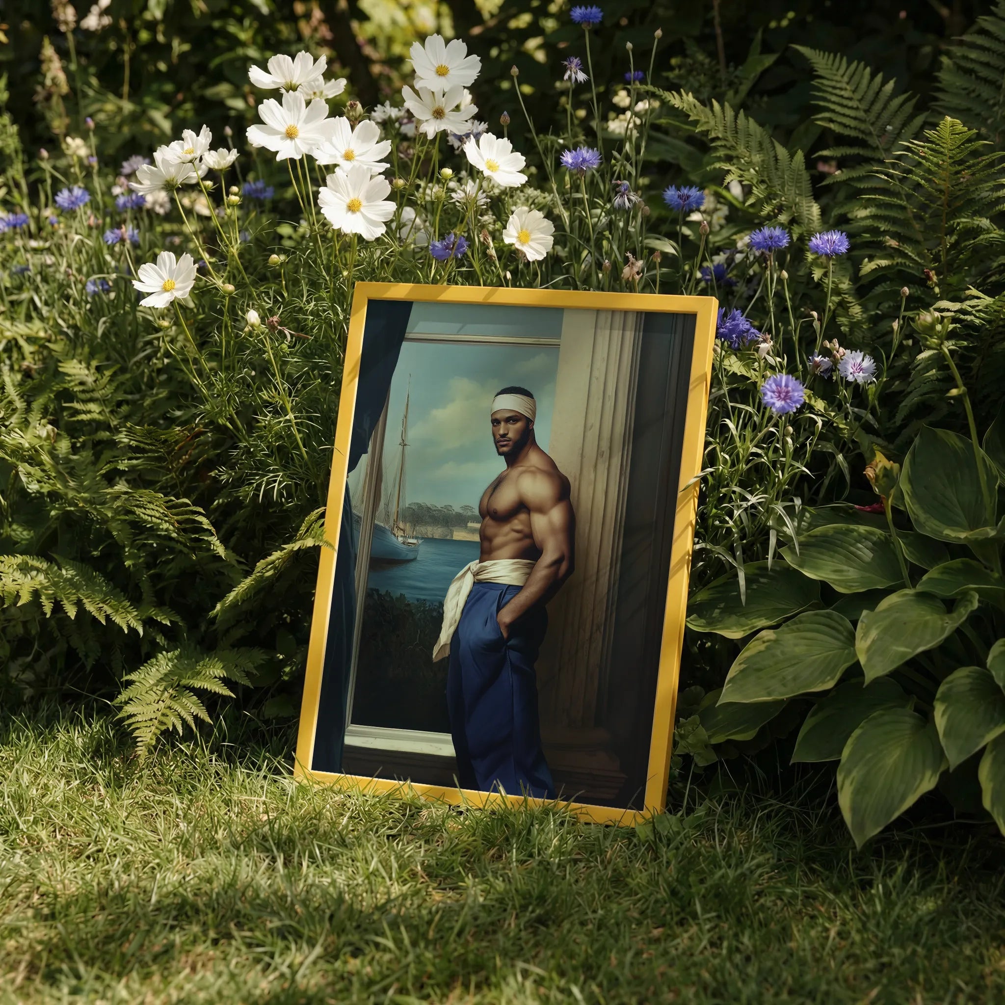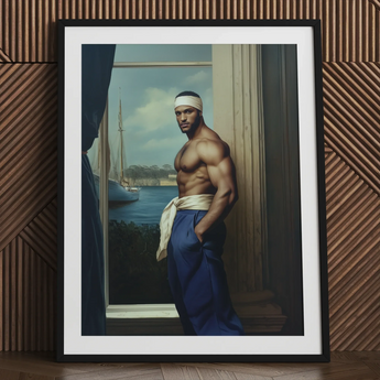 Vous êtes entraîné dans un monde de pouvoir sensuel et gay libération. Le commerce fait signe, un marin maure encadré par la fenêtre de l'histoire. Sa forme musculaire, une ode à la beauté masculine, se tient fièrement dans un contexte d'eaux azuriques et de voiles gonflées. Ce n'est pas seulement l'art - c'est une fenêtre sur homoérotique L'histoire est revenue dans ce fantasme néoclassique.