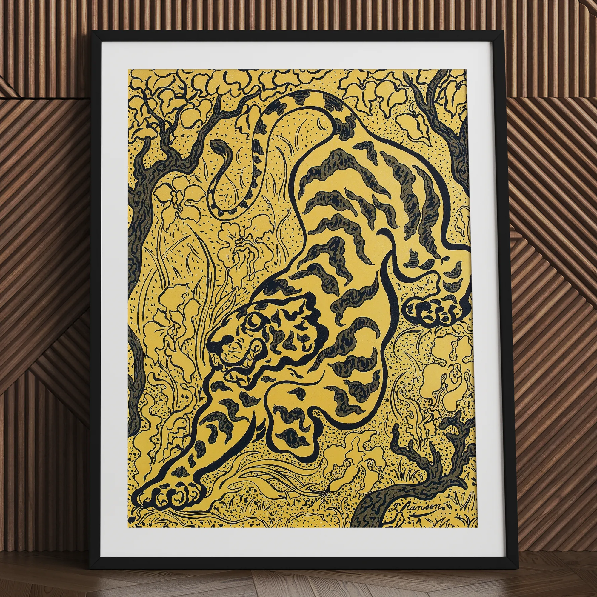 Rôdant à travers un mer de feuillage doré, le tigre de Paul Ranson saute de cet électrification imprimé art. Vous serez fasciné par la forme sinueuse du félin, gravé dans un ébène austère sur une toile de fond jaune vibrante. Ce n'est pas votre scène de jungle moyenne - c'est un rêve de fièvre de la nature distillée en une énergie pure et primitive.