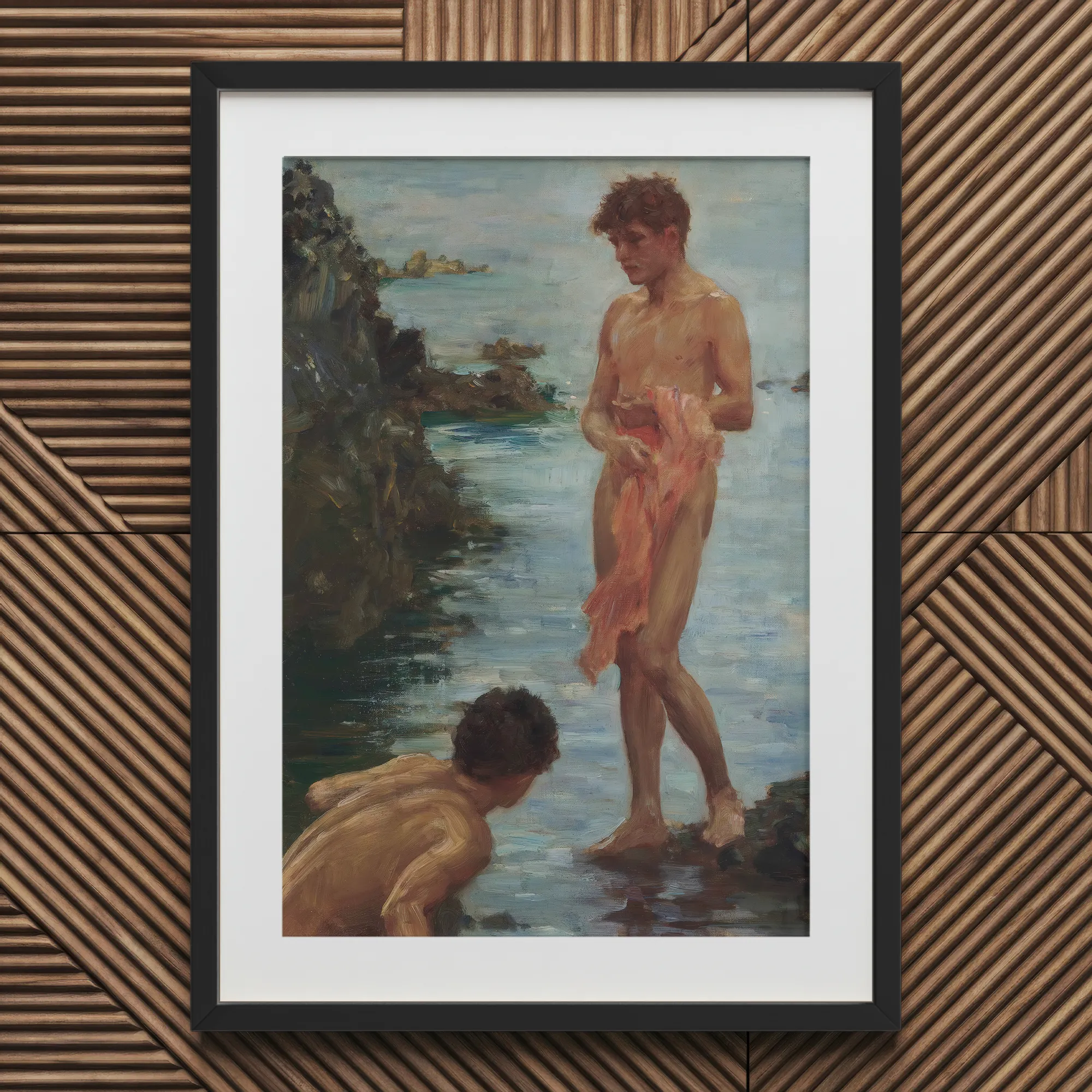 Dans cette nature sauvage imprégnée d'huile, deux jeunes hommes émergent, scintillant de l'ivresse marée de l'eau saumâtre et de la pierre ancienne. Le pinceau de Henry Scott Tuke répand leurs membres bronzés dans le calme froid d'une crique de Cornouailles, l'écho d'Éden réimaginé sous un soleil pâle et indifférent.