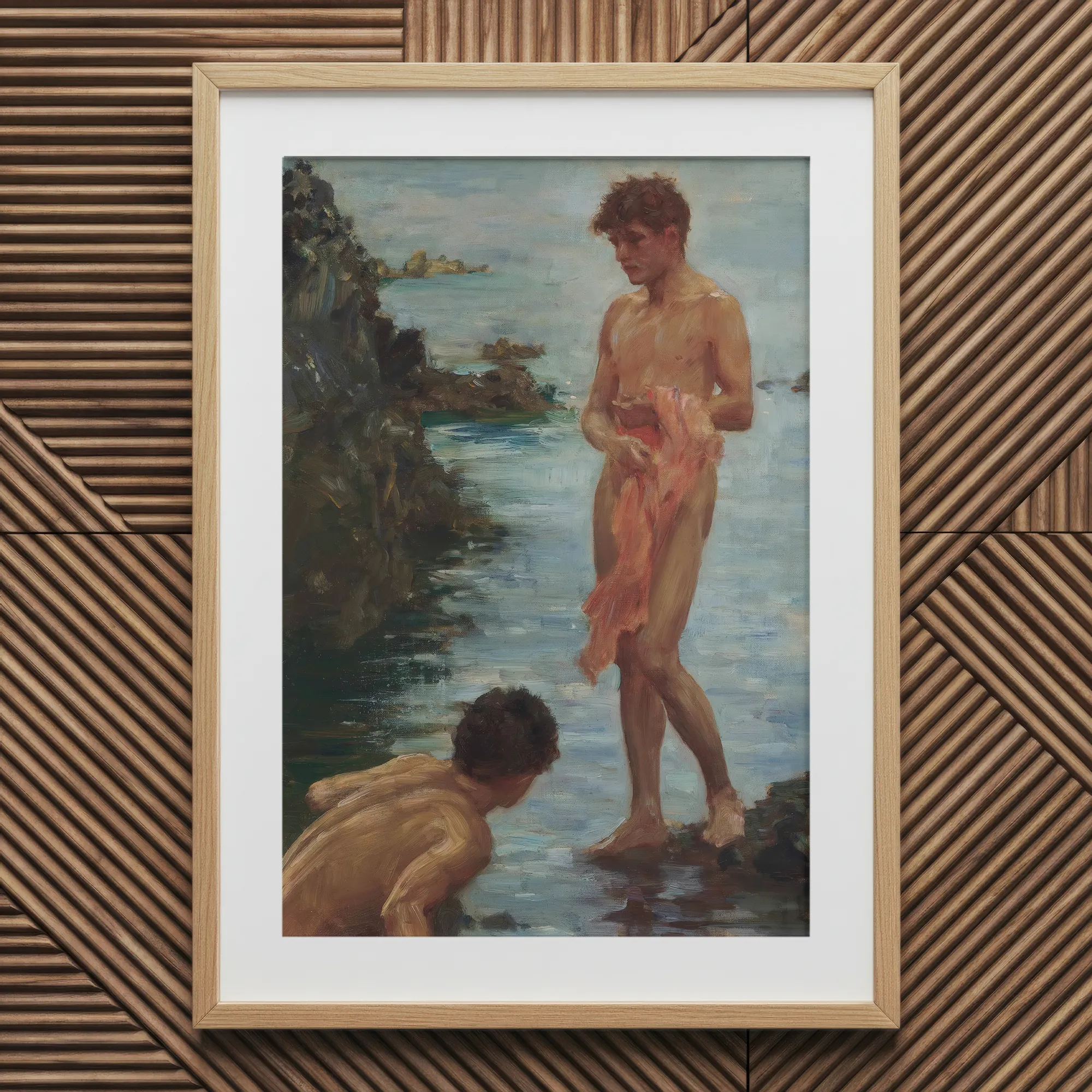 La figure debout, tendue par le froid de l'océan, berce un tissu de corail comme une relique de l'Atlantide, ses plis vermillon un totem de purification rituelle—doux, libidineux, tacite. L'autre jeune homme se penche en avant, la tête inclinée dans une humble curiosité, une dévotion primordiale, chaque coup de pinceau un hymne au corps nu, baptisé par le sel.