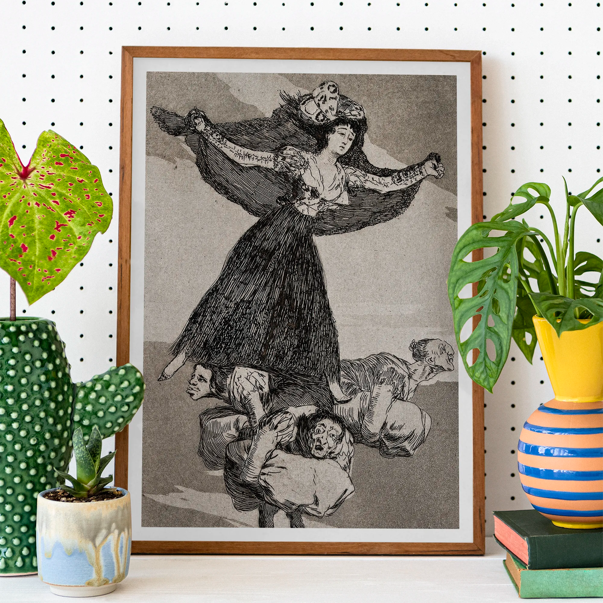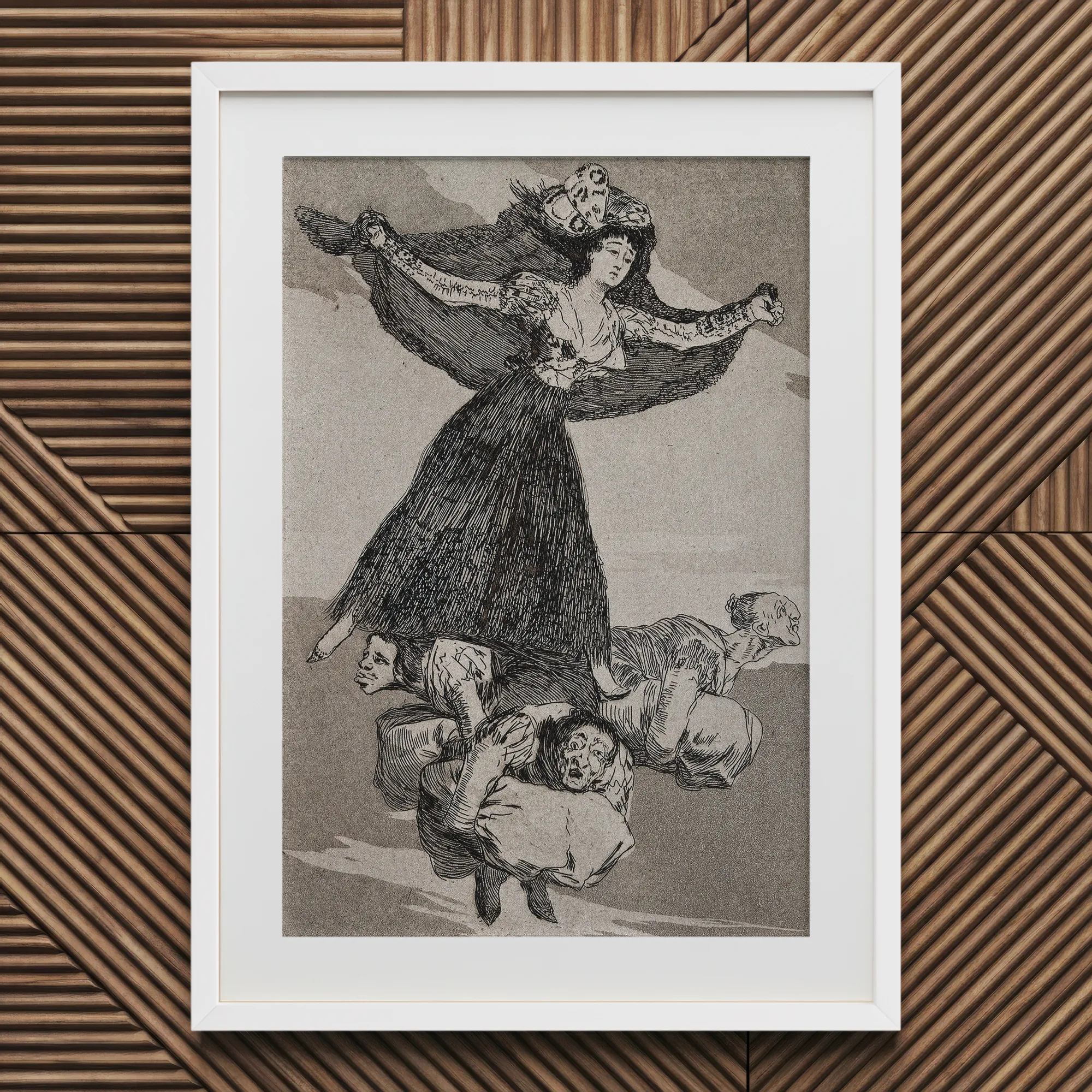 L'air vibre de tension entre gravité et grâce, intellect et désir. Cette estampe fine fusionne philosophie morale et lyrisme étrange, transformant le vol en métaphore de la condition humaine. La plaque de cuivre de Goya capture cette frontière volatile où l'aspiration tremble sur l'absurdité, où la volonté de s'élever devient à la fois salut et auto-tromperie. La femme plane intemporelle, illuminée par la lumière périlleuse de l'ambition.