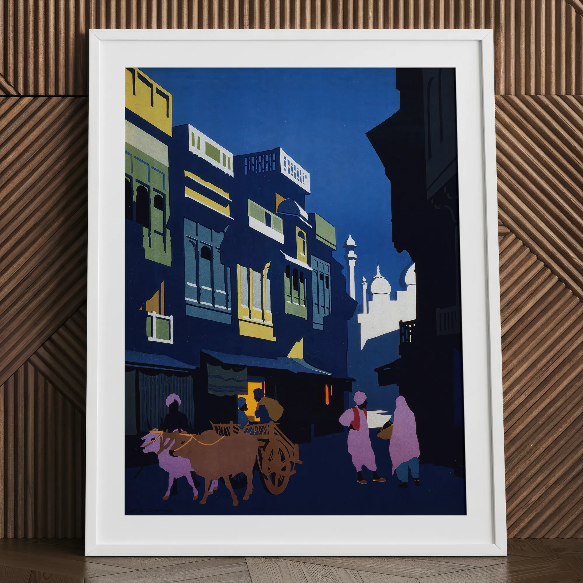 Sous une lune cobalt, cette soirée indienne exhale dans le crépuscule. Où une charrette tirée par des bœufs oscille entre des arcades sculptées et des avant-toits moghols, guidant les voyageurs au-delà des étals colorés de saris et des cours éclairées par des lampes.