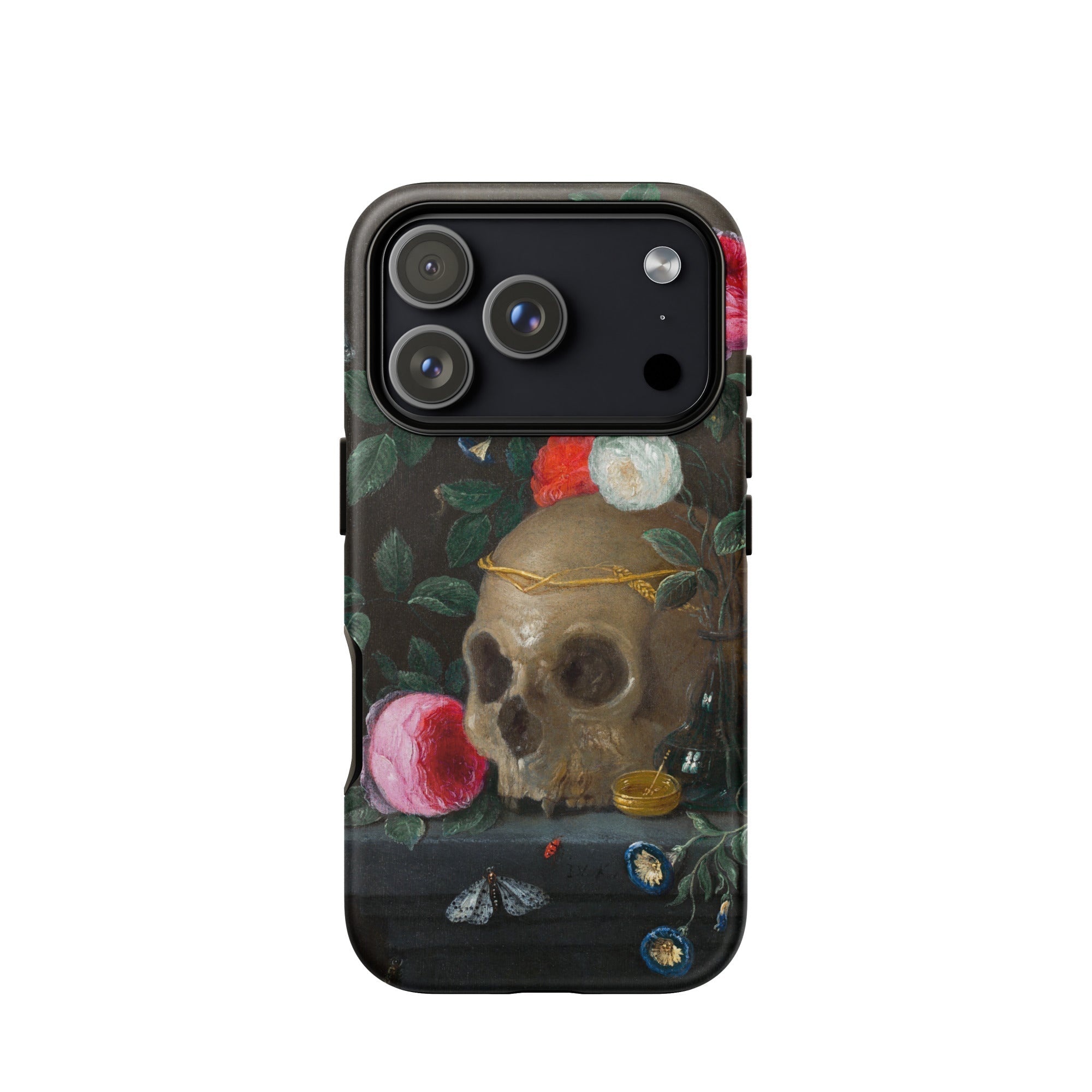 Sur cette coque de téléphone, l'image fige un monologue baroque en milieu de ligne : la beauté s'étouffe avec son propre excès. Pas un avertissement, mais une valse de fins lentes. Chaque objet—scarabée, bouton, rose—est peint avec une attention impossible, comme si l'attention seule pouvait dépasser l'entropie.