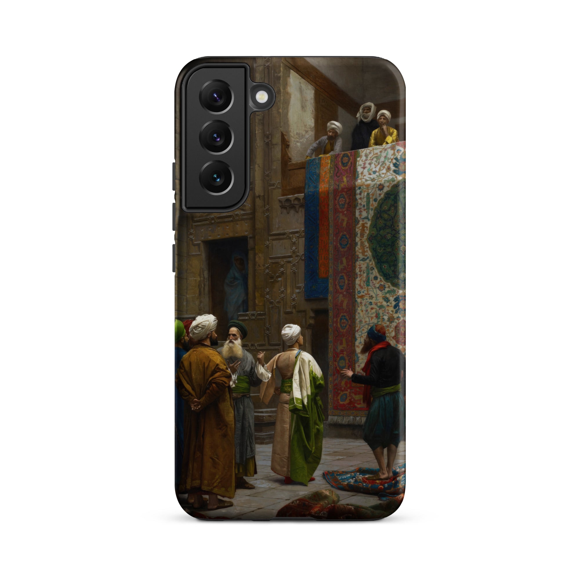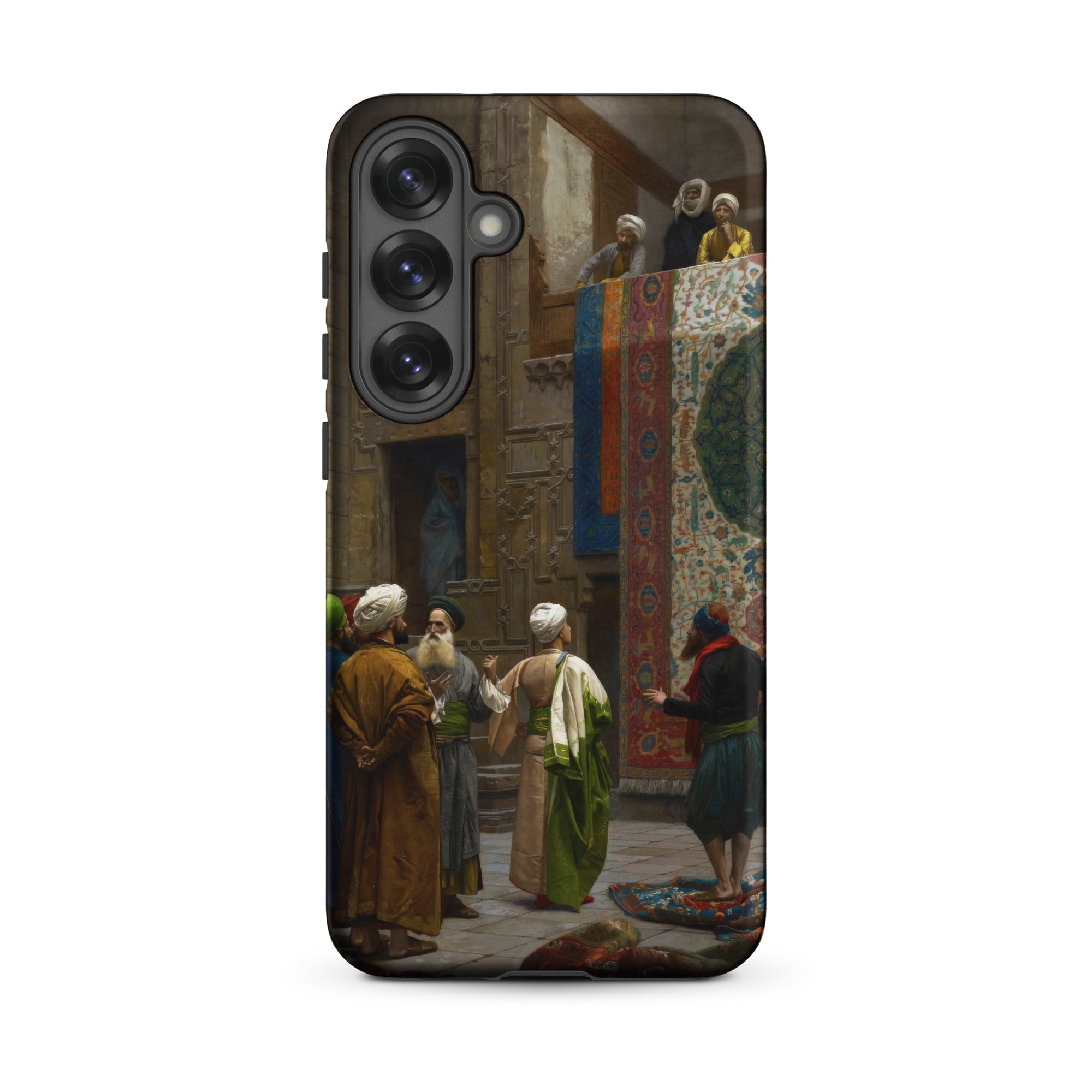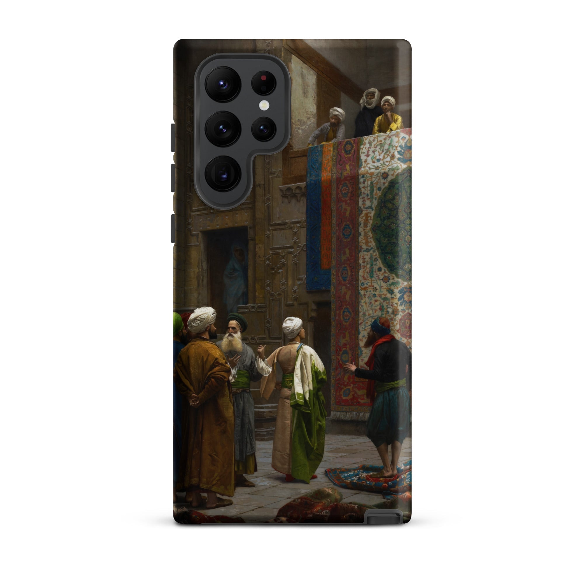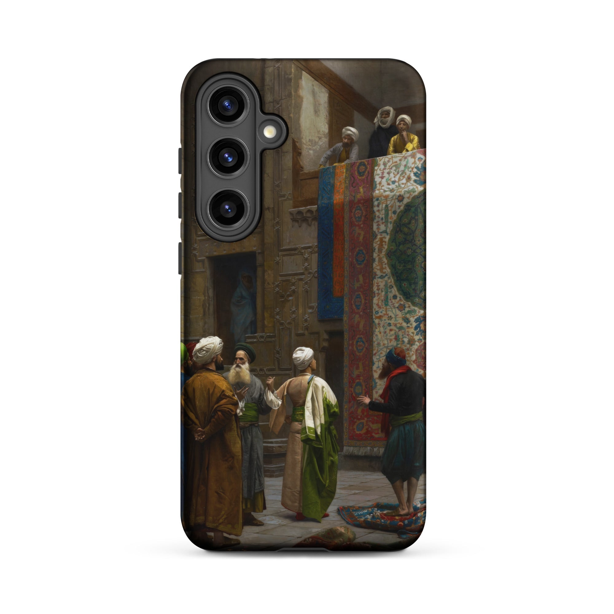 La porte sculptée encadre la transaction, son renfoncement ombragé suggérant des histoires cachées. Au-dessus, les spectateurs se penchent des balcons, à la fois jury et chœur. Cette coque Samsung capture ce moment d'échange mis en scène où l'art orientaliste a distillé les textures du design islamique, des textiles ottomans, de l'architecture cairote et de la précision académique française en un seul tableau.