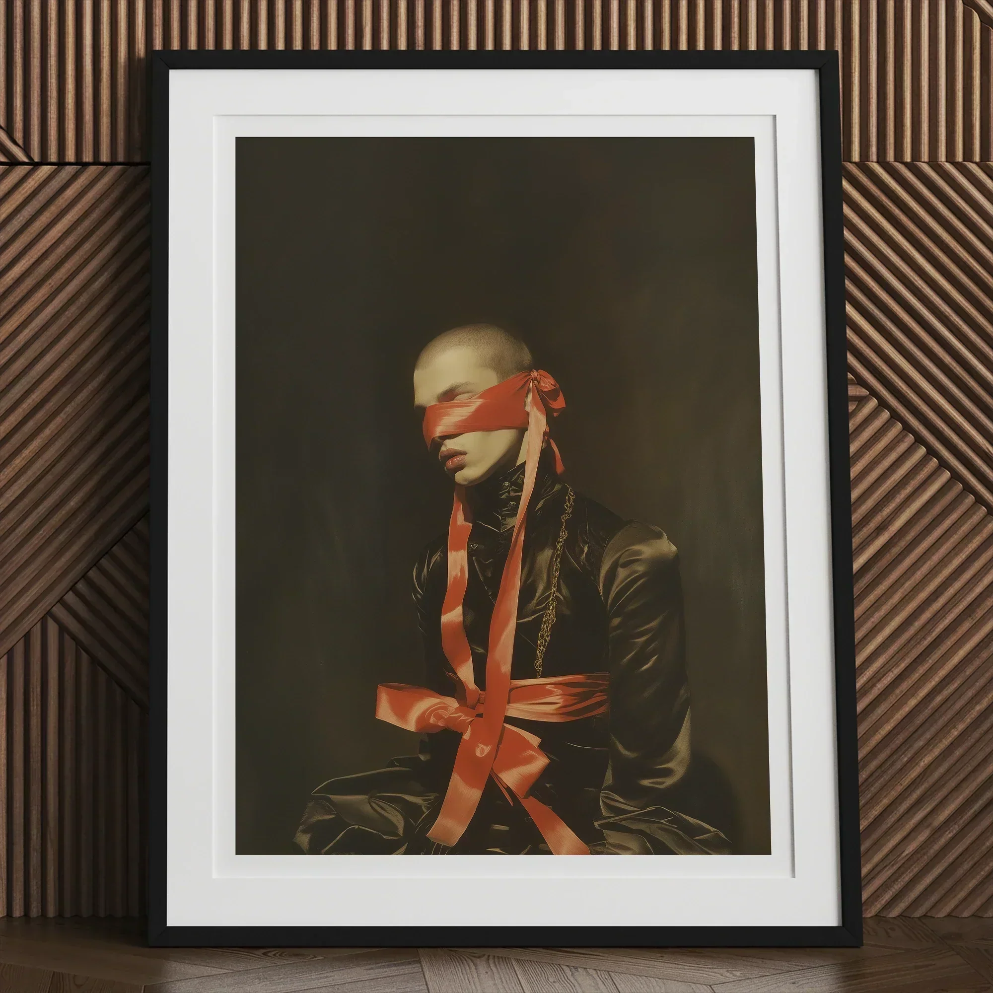 C'est le surréalisme gay hyperréaliste à son paroxysme enivrant. La brillance du bandeau capte la lumière comme le tranchant d'une lame, un moment suspendu entre révérence et défi. Le clair-obscur—un héritier direct du ténébrisme de Caravage—projette le sujet dans une ombre et une lumière contrastées, flottant entre rêve et discipline, presque ecclésiastique dans son drapé. Murmurant d'opulence baroque, subvertie maintenant en un acte avant-gardiste de soumission.