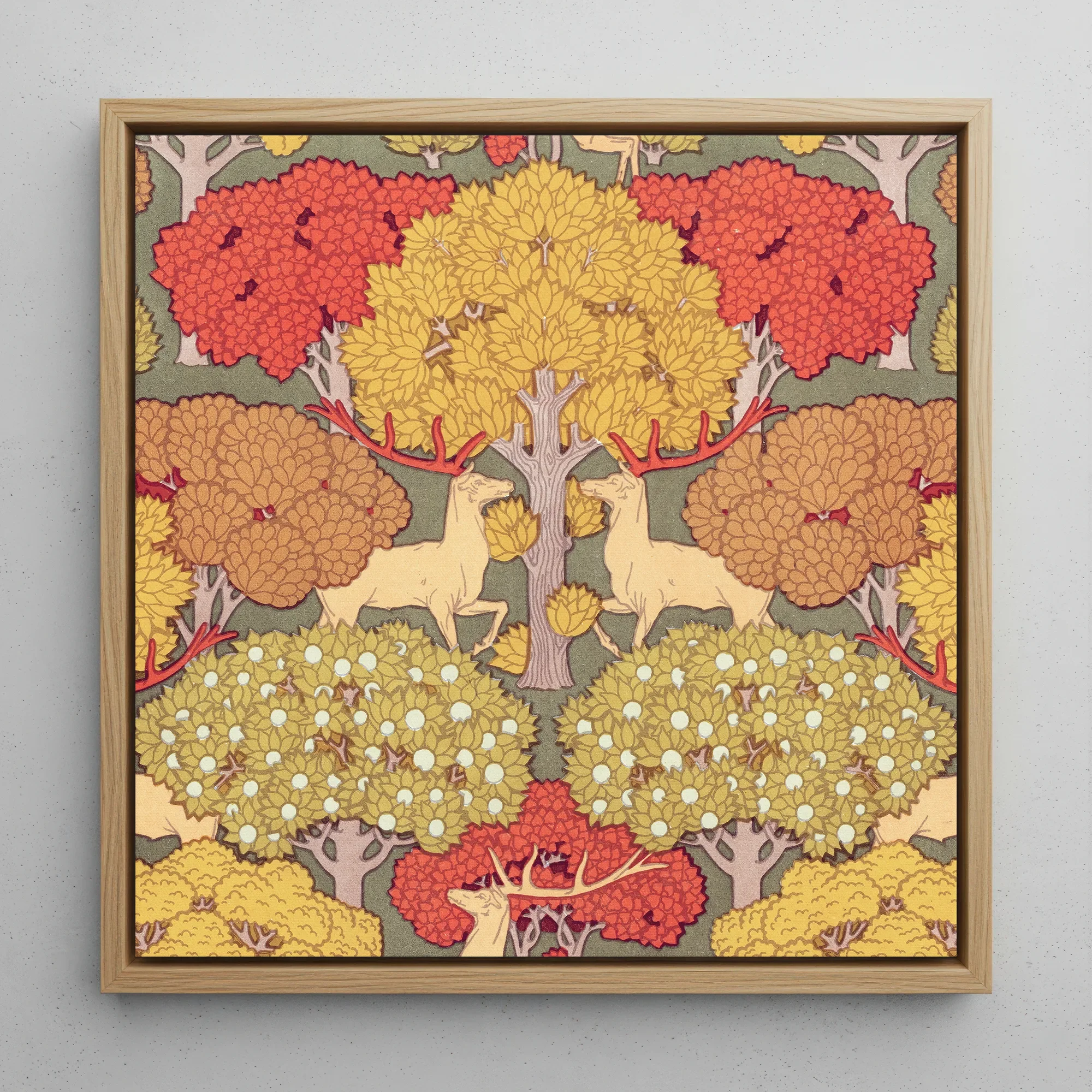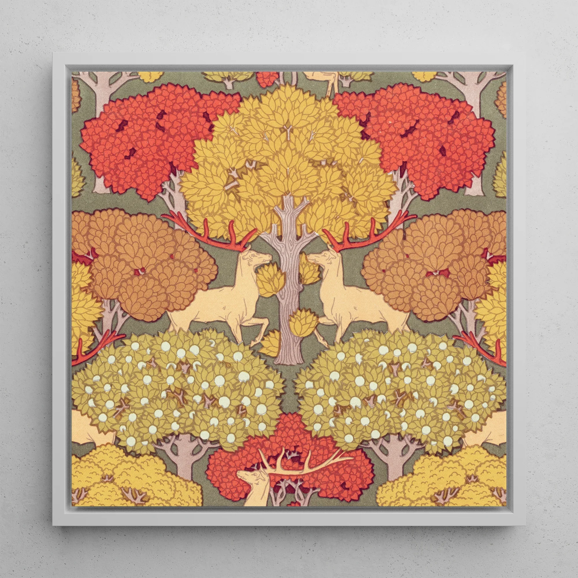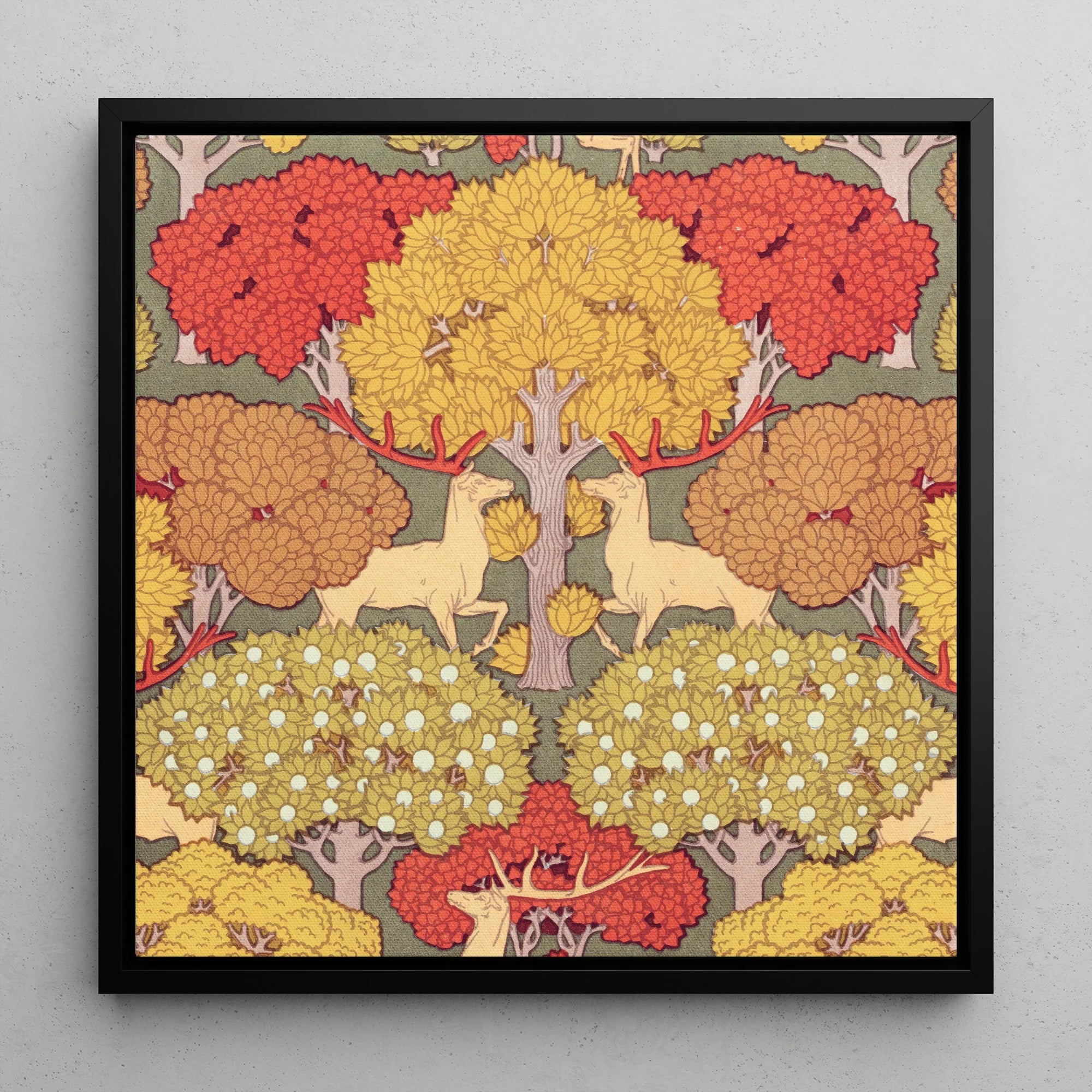 Float "Cerfs et Arbres" di Verneuil tela incorniciata Ti fa cenno in un regno in cui le forme sinuose di Art Nouveau ballano con l'energia grezza della natura. Questo capolavoro esplode in una sinfonia cromatica di cervo di zafferano, le loro orgogliose corna che rispecchiano i baldacchini arborei sopra.