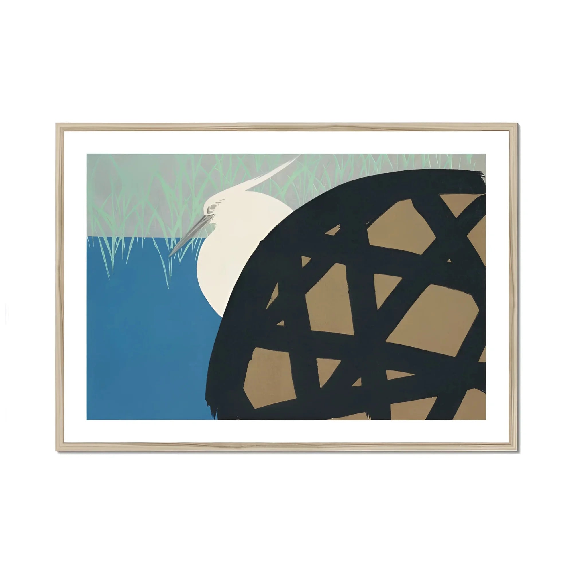 La quiete qui ha una forma: un airone fermo di profilo, che emerge appena dallo spazio negativo scolpito da un cesto di guerriero—il suo motivo rigido, deliberato, quasi brutale in contrasto con la morbida geometria della curva dell'uccello.