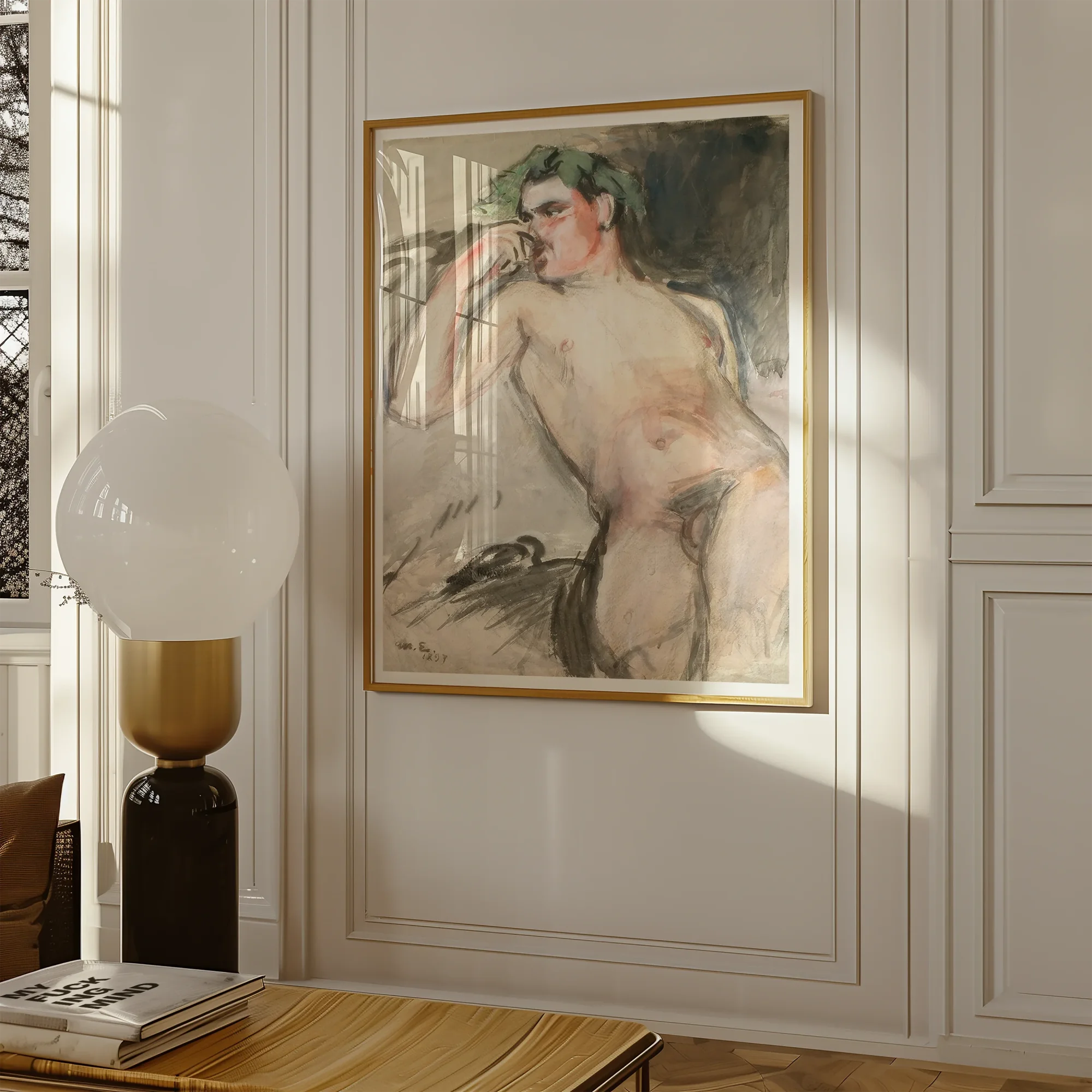 Il nostro eroe nudo, incoronato con una ghirlanda di alloro color saggio, vacilla sul precipizio dell'estasi e dell'oblio. La tavolozza di Enckell è un paradosso - contemporaneamente silenzioso ed elettrico, tutti verdure malato e rosa arrossati che pulsano con energia carnale. La mano della figura, sollevata in ciò che potrebbe essere estasi o disperazione, diventa un condotto per la corrente emotiva grezza del dipinto.
