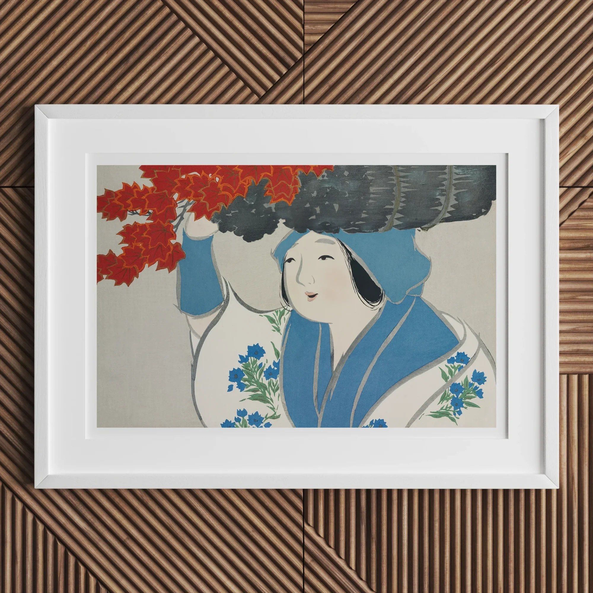 Piega i tuoi occhi sulla figura robata di ceruleo, il suo kimono adornato di Gentian una tela di eleganza. Meravigliarsi della profondità del calore e della sensazione che vediamo nel suo viso sereno. Una testimonianza del genio minimalista di Sekka. L'acero scarlatto lascia sopra la sua danza in vivido contrasto, mentre la nave grigia inchiostrata che porta parla di volumi di lui, carico di tesori cremisi.