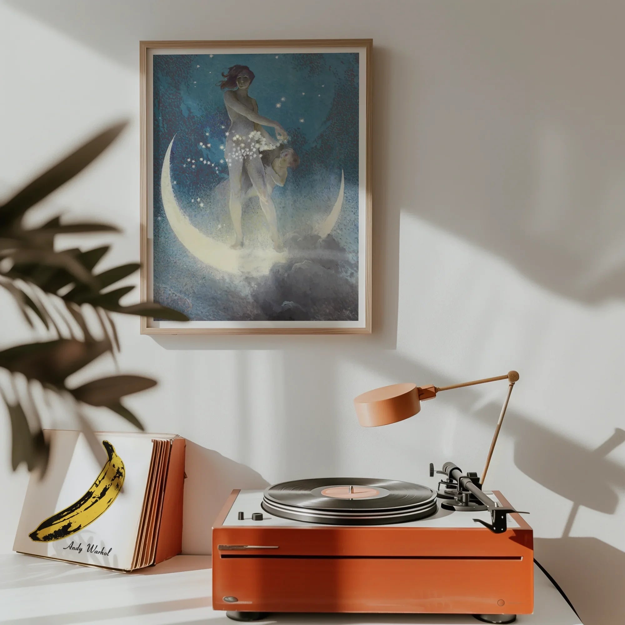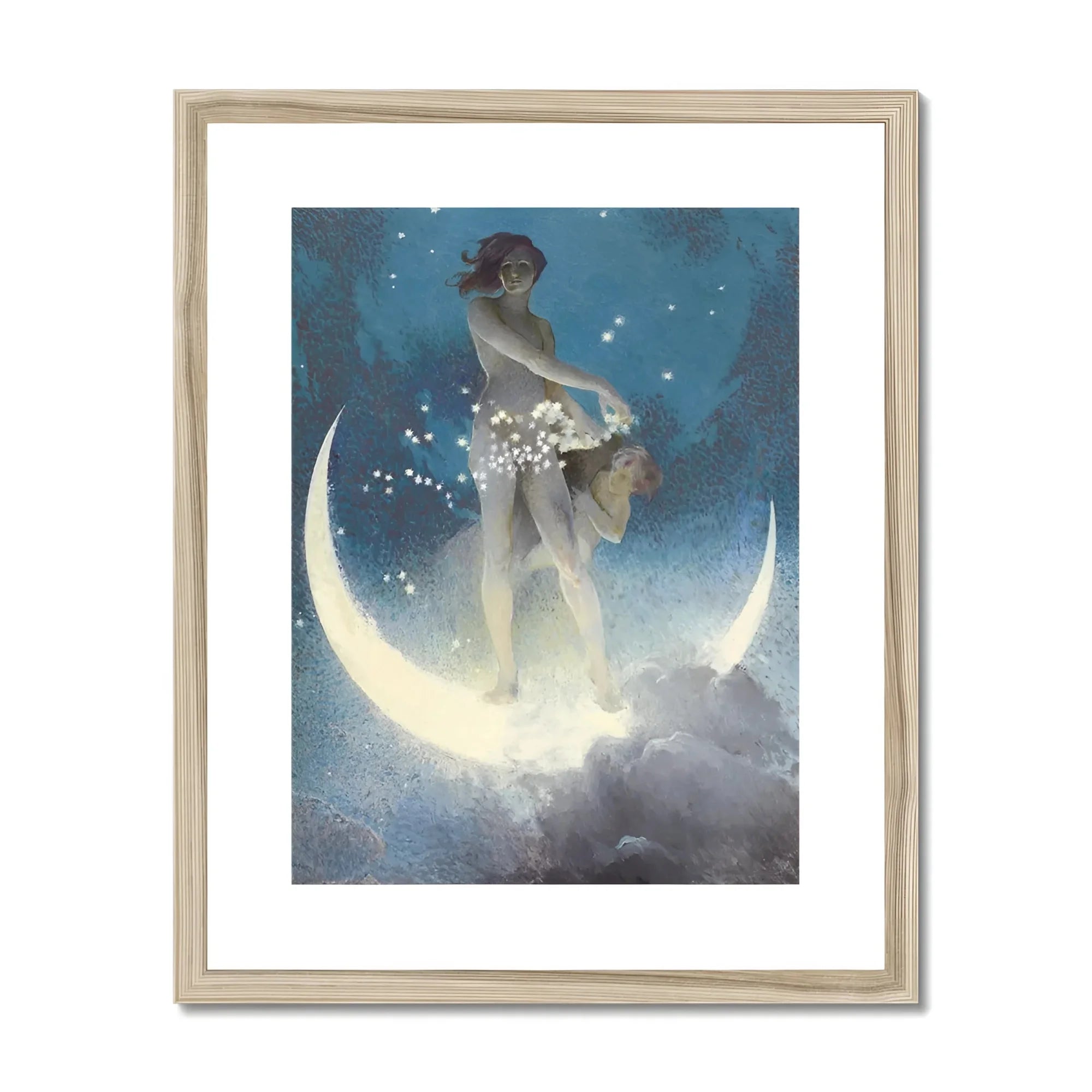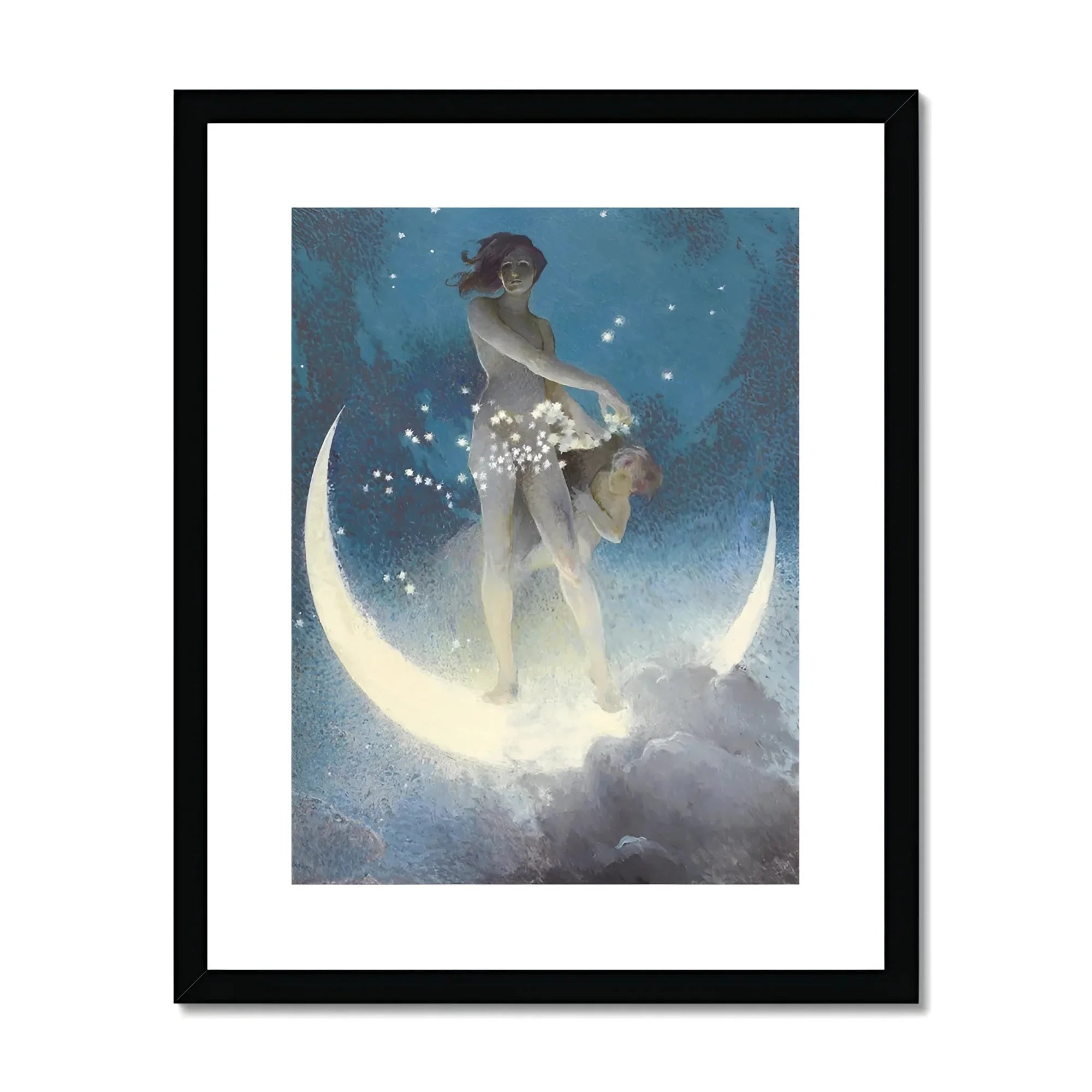 Nuoterai attraverso le stelle per dare un'occhiata a questa meraviglia eterea, "Spring Scattering Stars" di Edwin Blashfield. Mentre guardi questa fantasticheria celeste, una dea mistica, arroccata su una luna di mezzaluna argentea, affascerà la tua immaginazione. La sua forma aggraziata, bagnata al chiaro di luna, è pronta a scatenare una cascata di stelle scintillanti attraverso il cielo notturno vellutato.