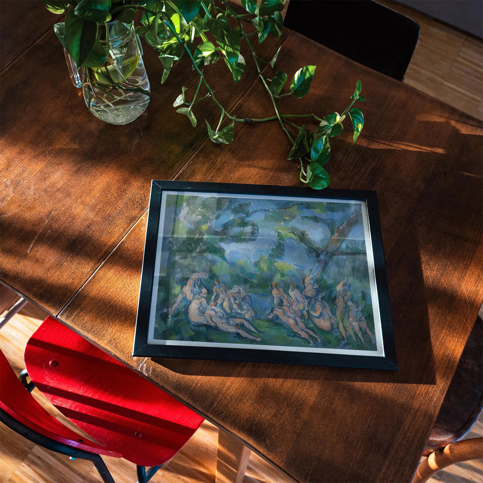 Questo capolavoro postimpressionista sfida le prospettive convenzionali, invitandoti a esplorare un mondo in cui elementi umani e naturali si uniscono nell'astrazione armoniosa. Le pennellate audaci di Cézanne e la palette luminosa danno la vita in questa scena pastorale, creando una tensione accattivante tra composizione classica e espressione moderna.