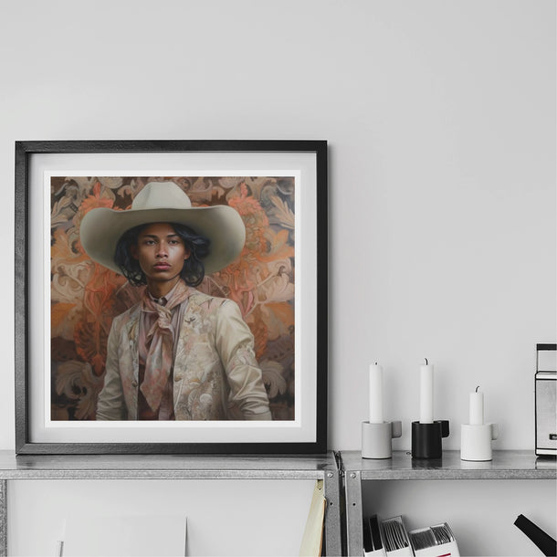 Questo è più di arte gay del cowboy; è un manifesto. Un'odissea queer Tamil, un'esplorazione dell'identità LGBTQ+ indiana nell'arte occidentale, una rivendicazione del cowboy queer marrone perso nella storia. Perfetto per collezionisti di stampe queer decolonizzate, estetiche vintage sudasiatiche e ritratti di frontiera omoerotici. Appendilo e lascia che la sfida ardente di Arjuna persista.