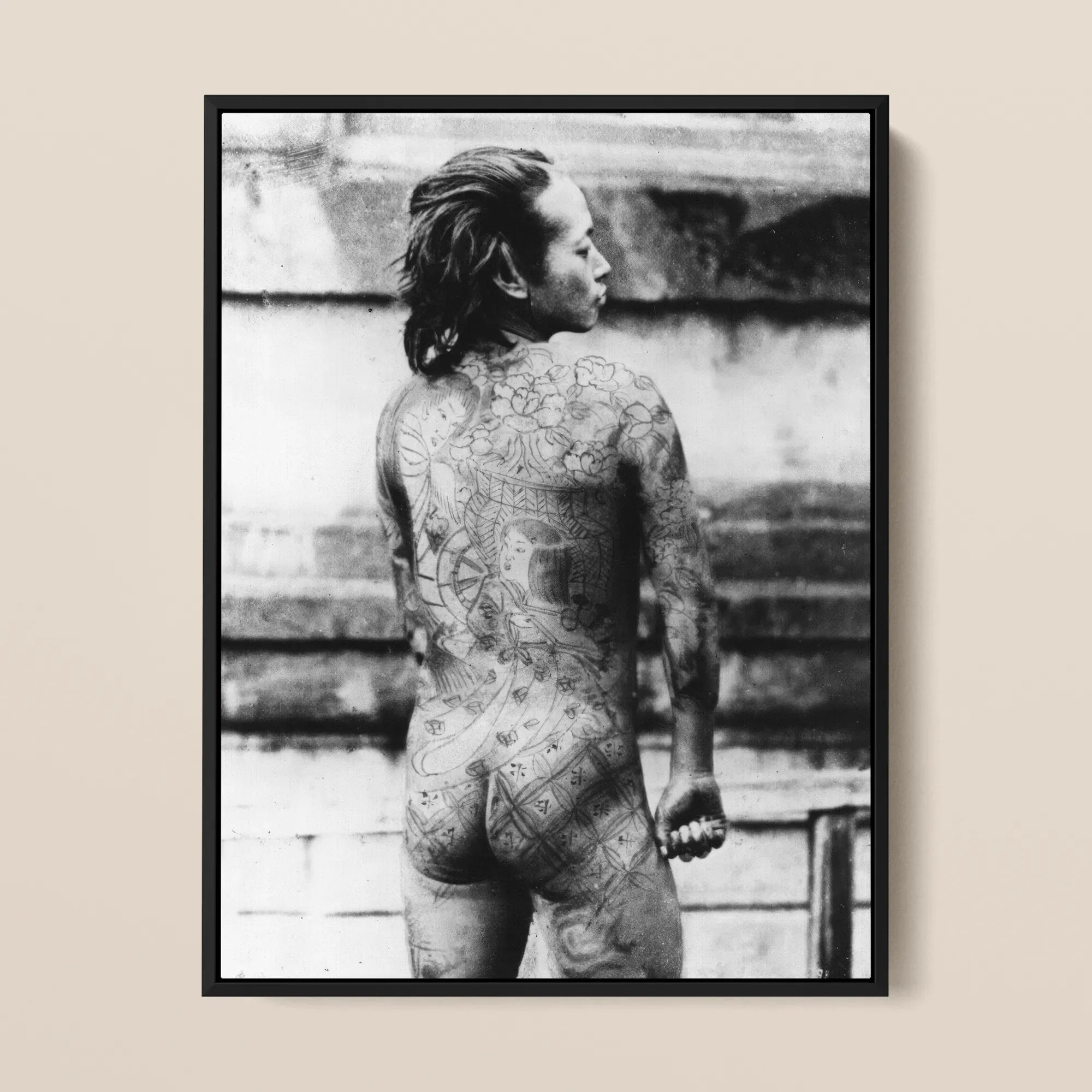 La fotografia cattura non solo l'arte del tatuaggio tradizionale giapponese ma anche il suo intreccio con la vita sotterranea, connotando giocatori d'azzardo, pompieri e narratori dei vicoli di Edo. Il suo pugno chiuso, visibile al bordo dell'inquadratura, ancora il ritratto con tensione, suggerendo sia prontezza che moderazione.