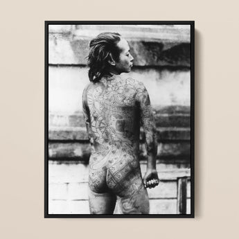 Il betto tatuato volta le spalle all'obiettivo, ma nulla sembra nascosto: l'inchiostro mappa ogni superficie. Una rete di motivi geometrici scende a cascata, mentre grappoli floreali si alzano in piena fioritura. Sulle sue spalle compaiono due donne, le cui espressioni serene ricordano i ritratti su blocchi di legno del bijin-ga, dissolvendosi in peonie e pieghe tessili.