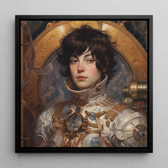 Chloé si sposta attraverso la marea astrale, un'astronauta lesbica francese sospesa tra gravità e memoria. La sua tuta è un capolavoro di ingegneria aerospaziale steampunk, splendente sotto il silenzio dello spazio profondo—un ornato esoscheletro celestiale dove il barocco filigrana in ottone si intreccia con la fredda precisione del retro-futurismo. Ogni quadrante, ogni lente lucidata, è un artefatto di un altro mondo, una fusione di estetica art nouveau di fantascienza e il pulsare dell'innovazione.