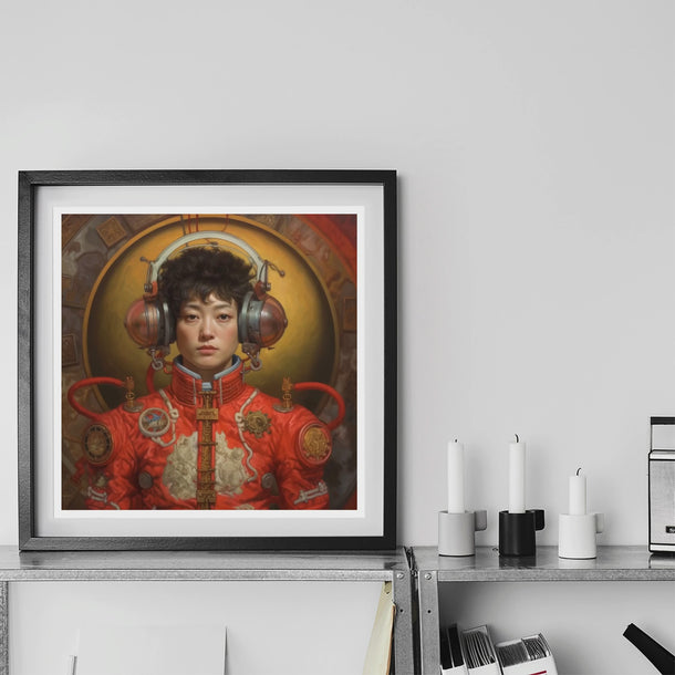 Mùchén si trova nel vuoto cosmico, un astronauta gay cinese incorniciato da un'aureola dorata. La sua espressione è risoluta: un taikonauta che porta la storia, l'identità e l'orgoglio oltre la Terra. Capelli neri scompigliati, occhi affilati come un guerriero-sapiente, traccia la sua traiettoria tra le stelle.
