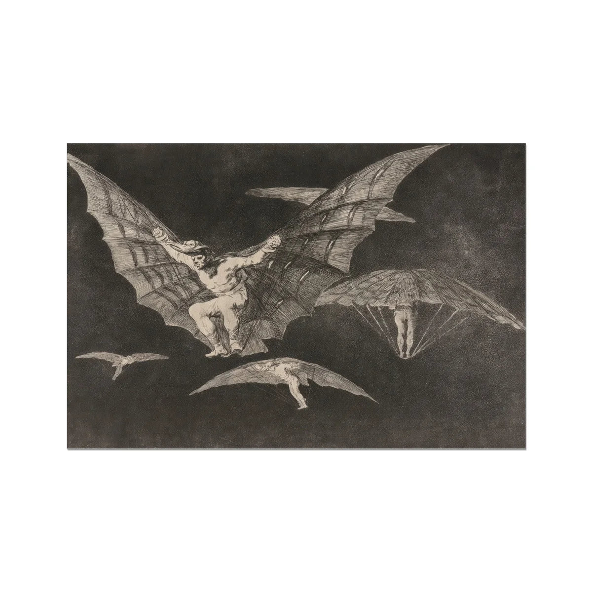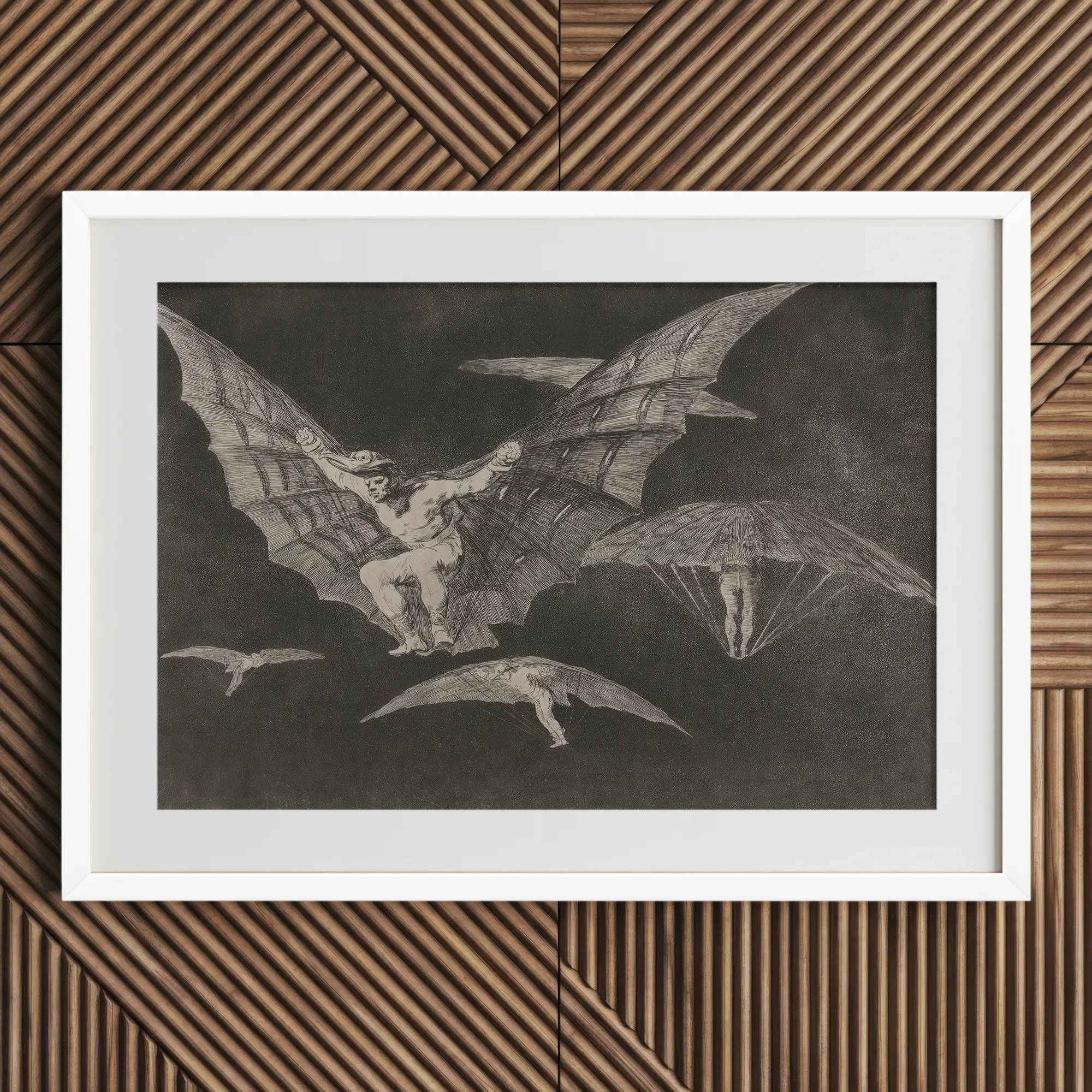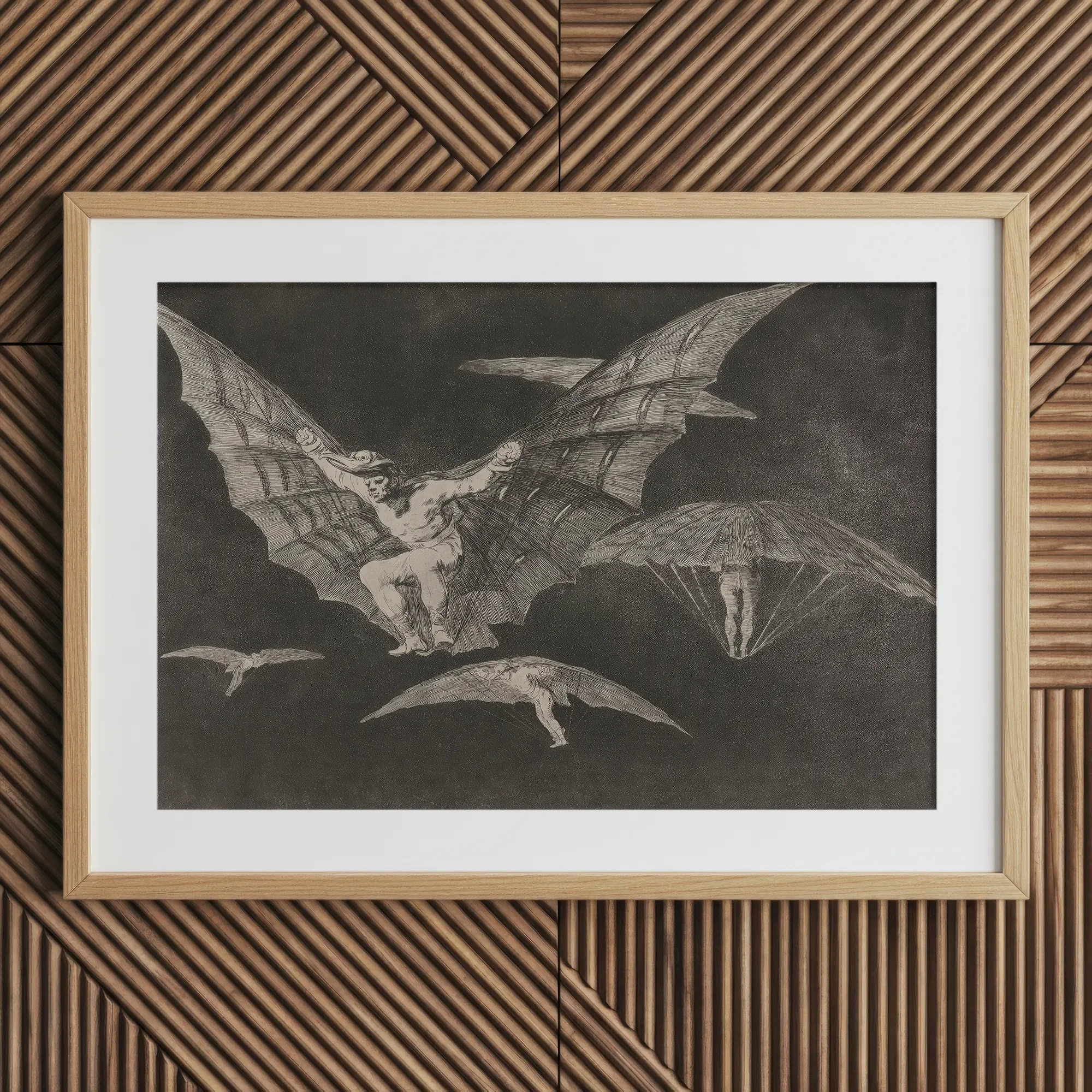 In Where There’s a Will There’s a Way, Goya cattura la febbre dell'invenzione. Uomini alati si slanciano in un vuoto stellato, metà filosofi, metà sognatori. La fede illuminista nel progresso incontra la fame romantica di trascendenza.