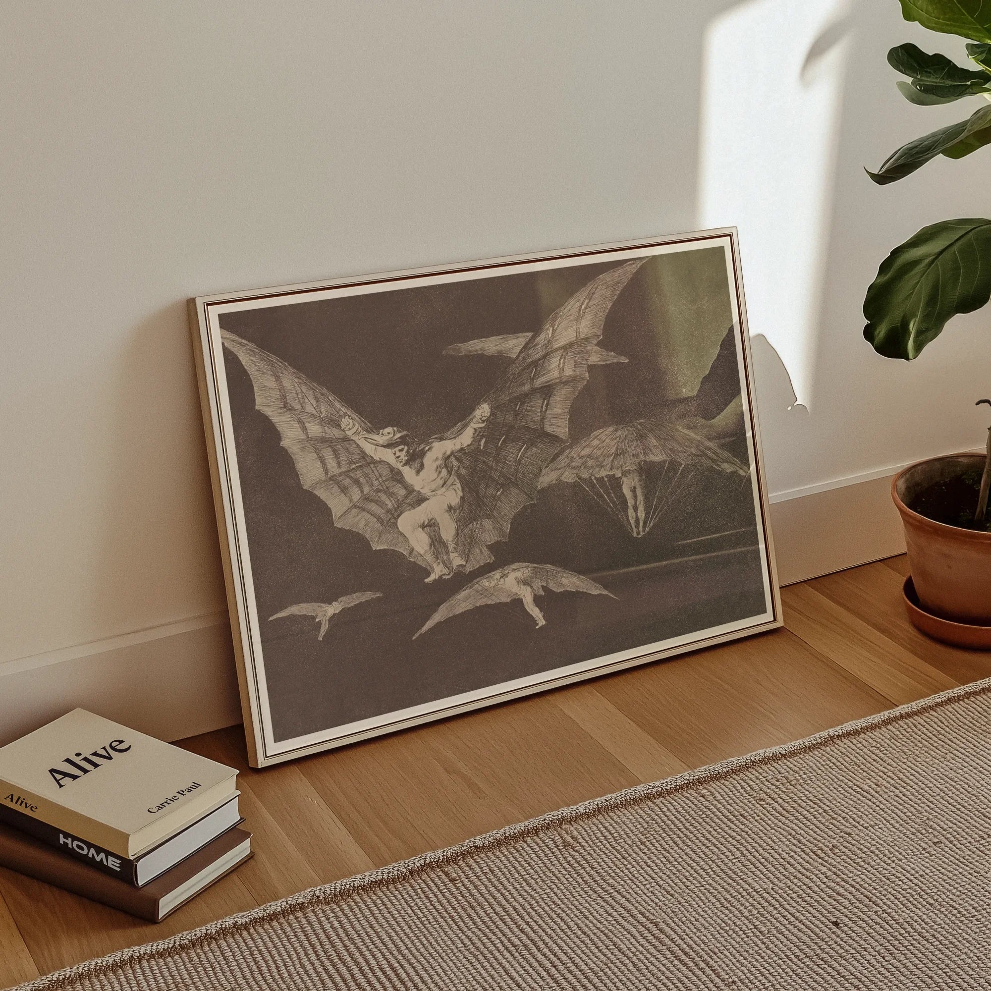 Sospesi tra terrore e trascendenza, queste figure si sforzano contro la memoria della gravità. E la scena brilla d'ironia: la ragione che dà nuovamente vita al mito. Il cielo di Goya diventa sia laboratorio che confessione. Dove la forza di volontà svolazza come una candela che cerca il sole e teme la propria estinzione.