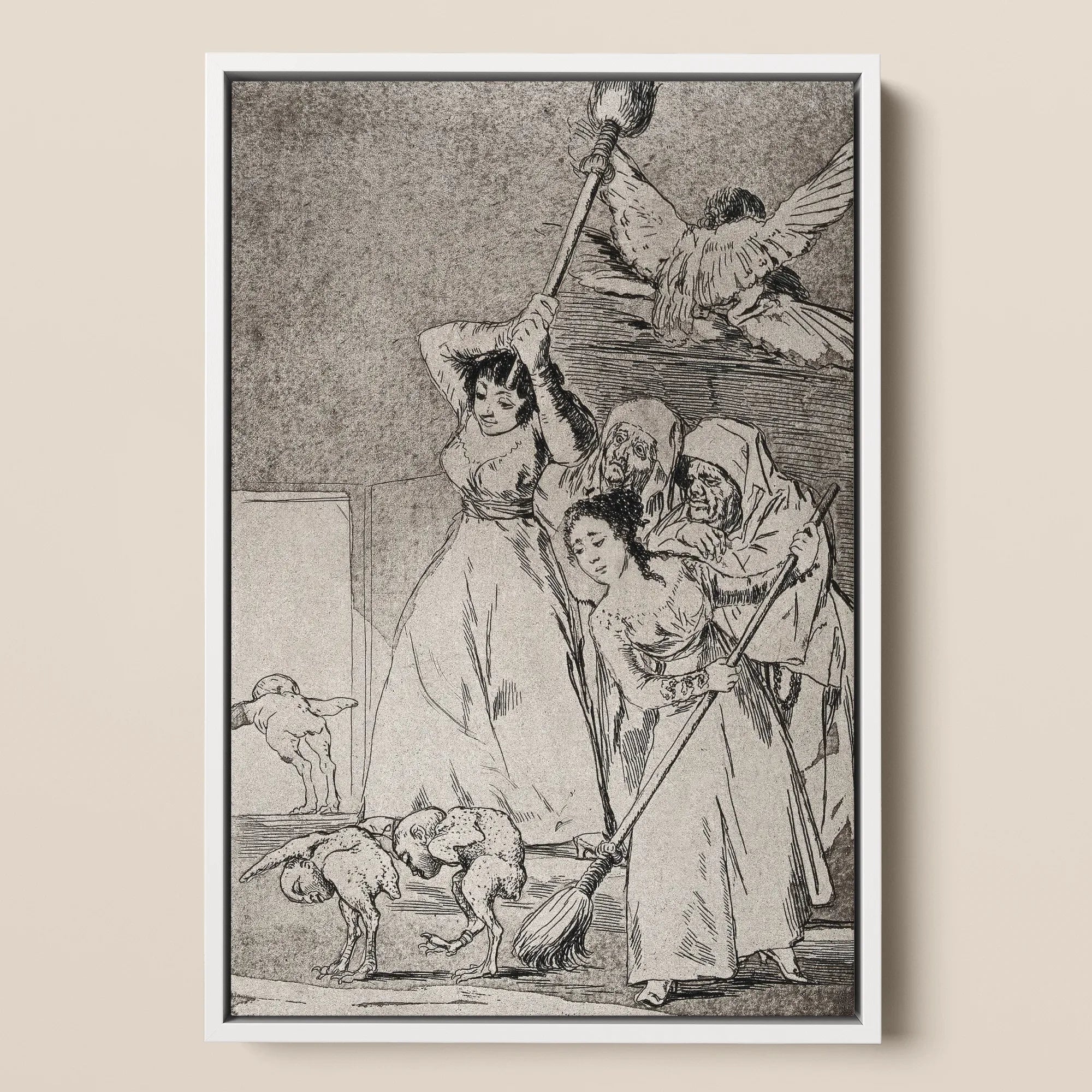 Due giovani donne che inseguono e spazzano figure di uccelli con teste di uomini fuori da una porta, incoraggiate da due vecchi in abiti religiosi - Tela incorniciata di Francisco Goya