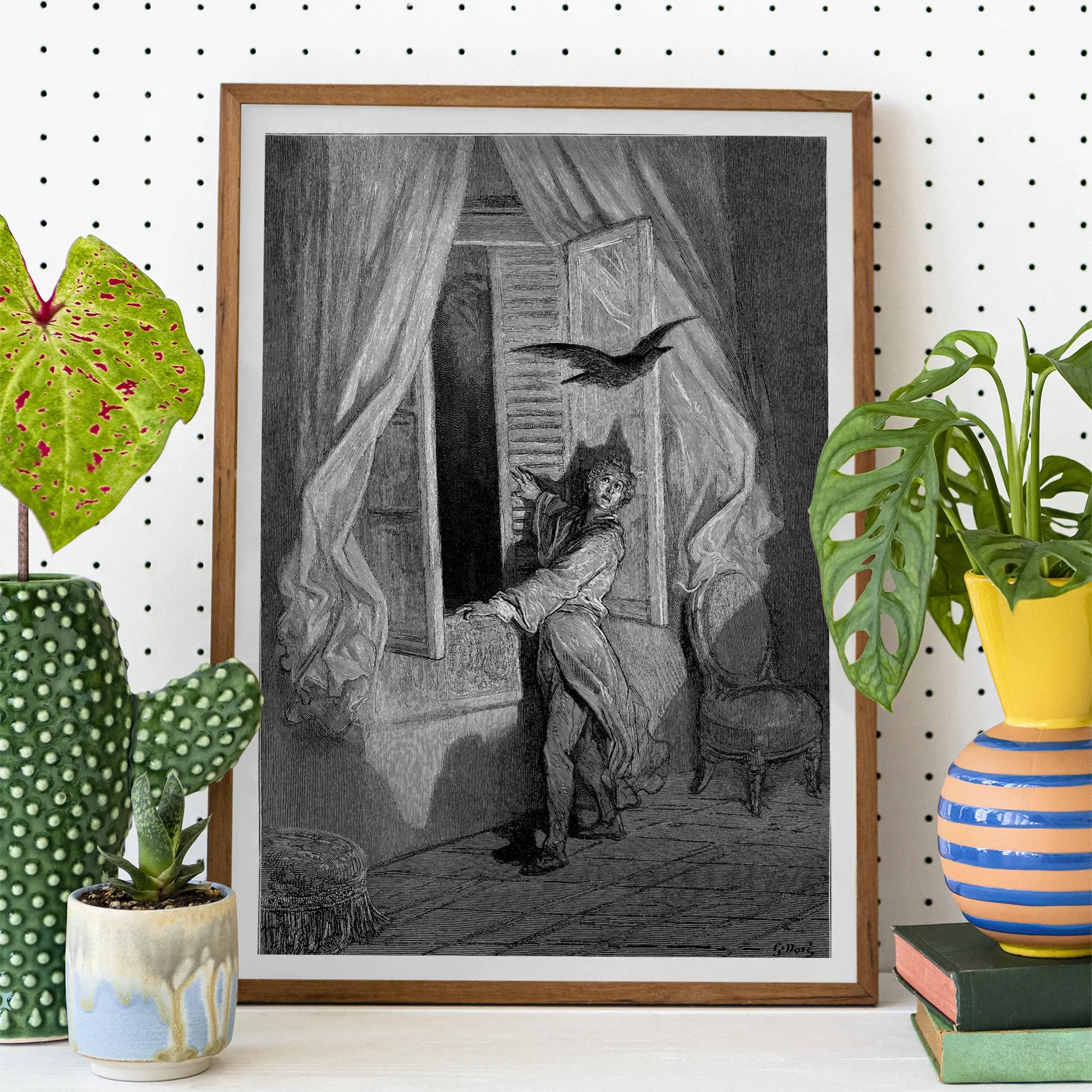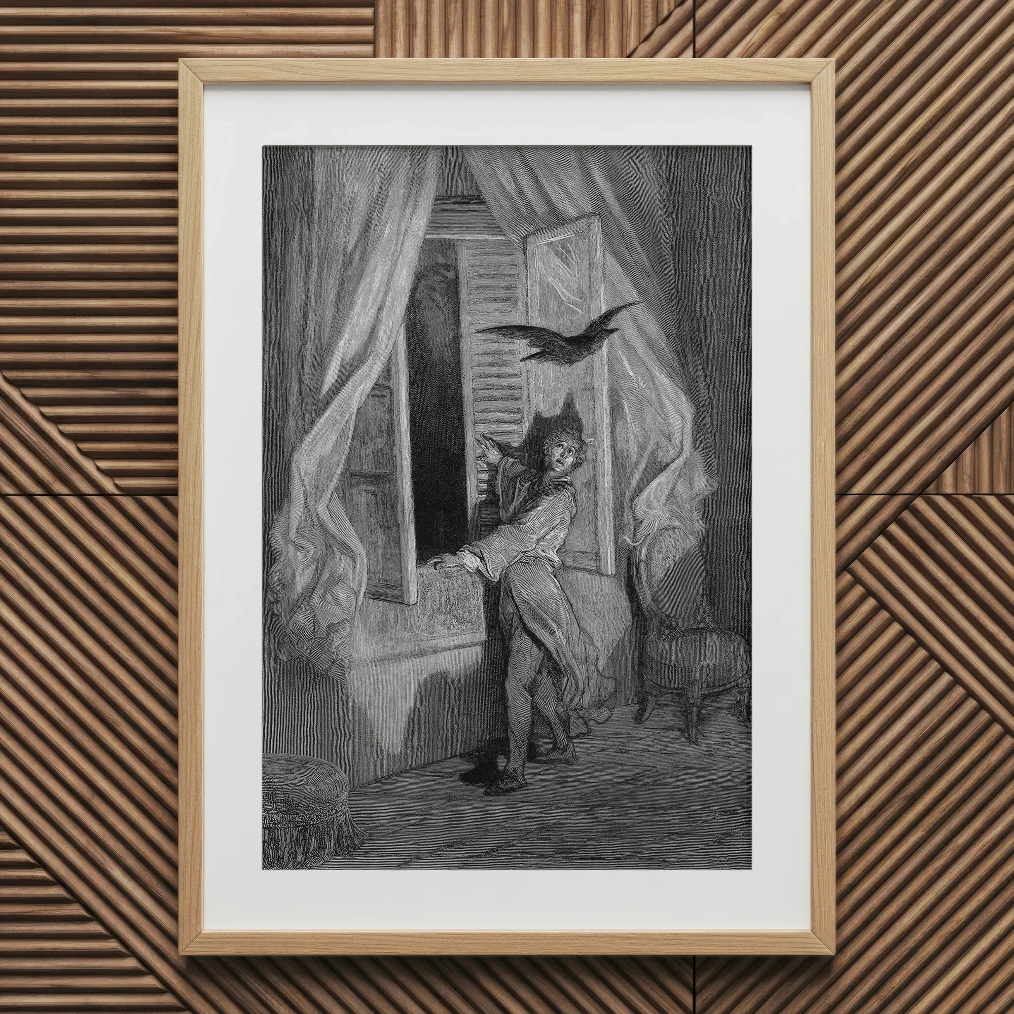 Il corvo guarda verso l'esterno, oltre il dolore, oltre il tempo stesso, verso un abisso che quasi assomiglia alla pace. Qui, la disperazione raggiunge la cerimonia; la rivelazione sorge attraverso la rovina. Doré trasforma la follia di Poe in una teologia disegnata interamente in nero.