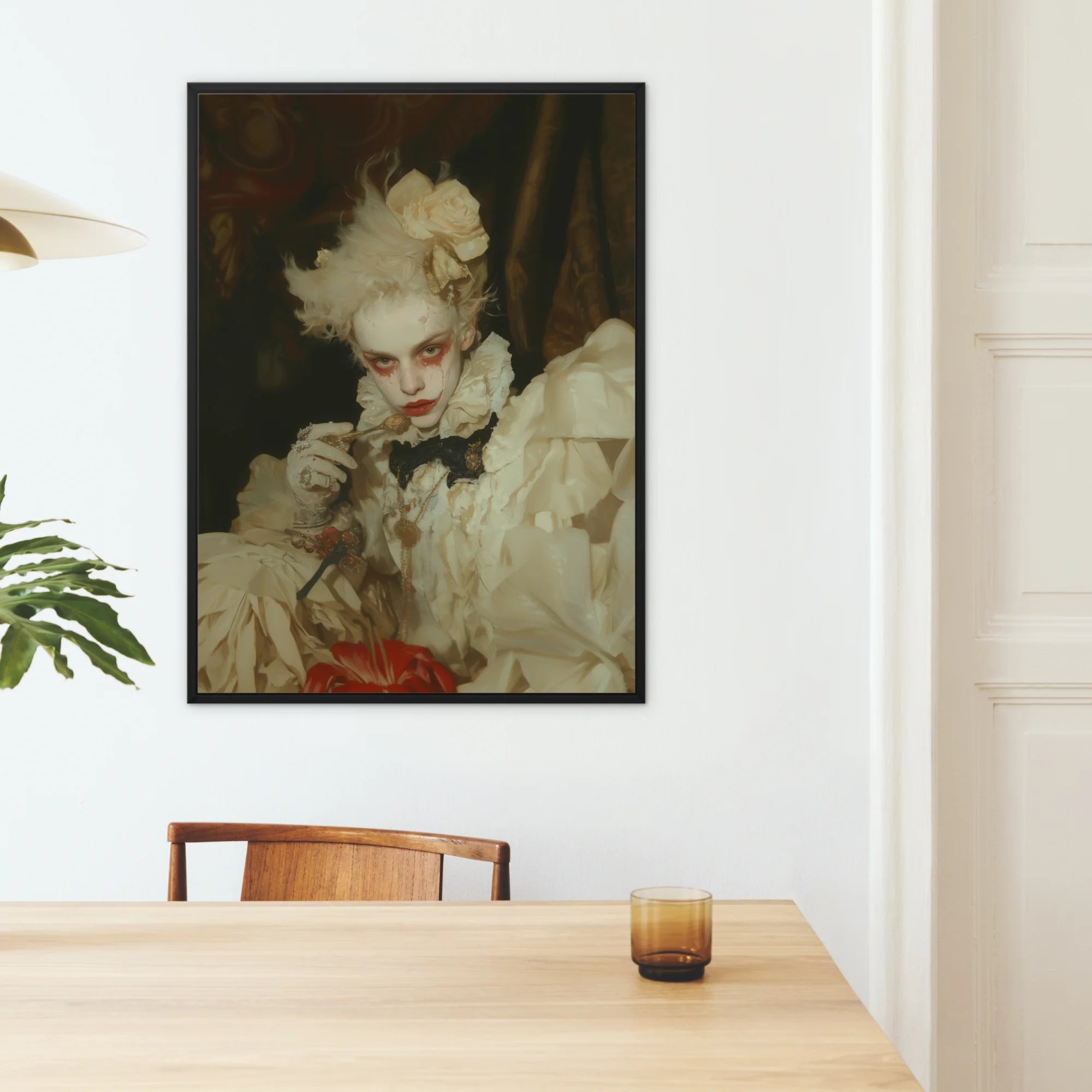 Fissi il vuoto, e il vuoto ti fissa. Un incubo barocco avvolto in volant e pizzi, la sua pelle d'alabastro risplende sotto un bagliore malsano. Un cherubino diabolico con labbra rosso sangue—sbavate, morse, insaziabili. Il suo sguardo ti immobilizza, sfidandoti ad avvicinarti, attirandoti nelle profondità inquietanti del surrealismo gotico.