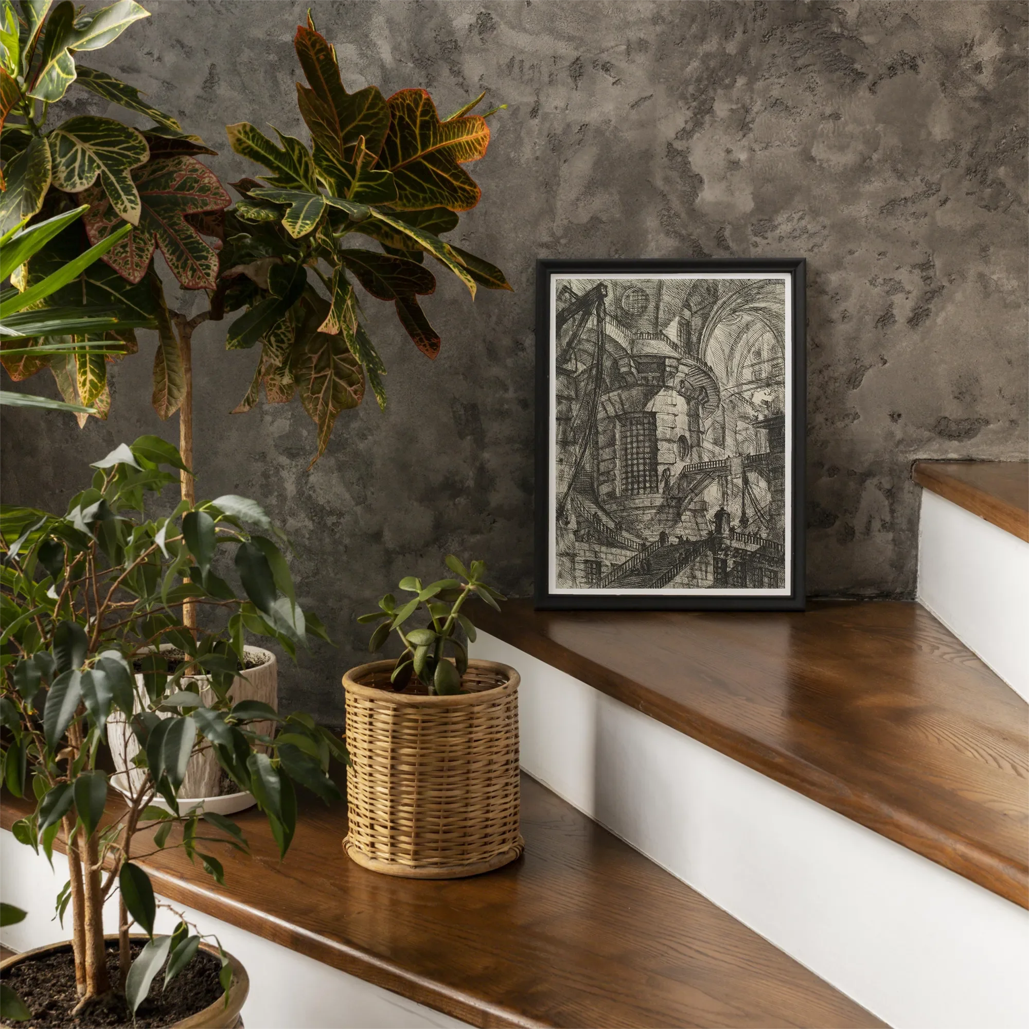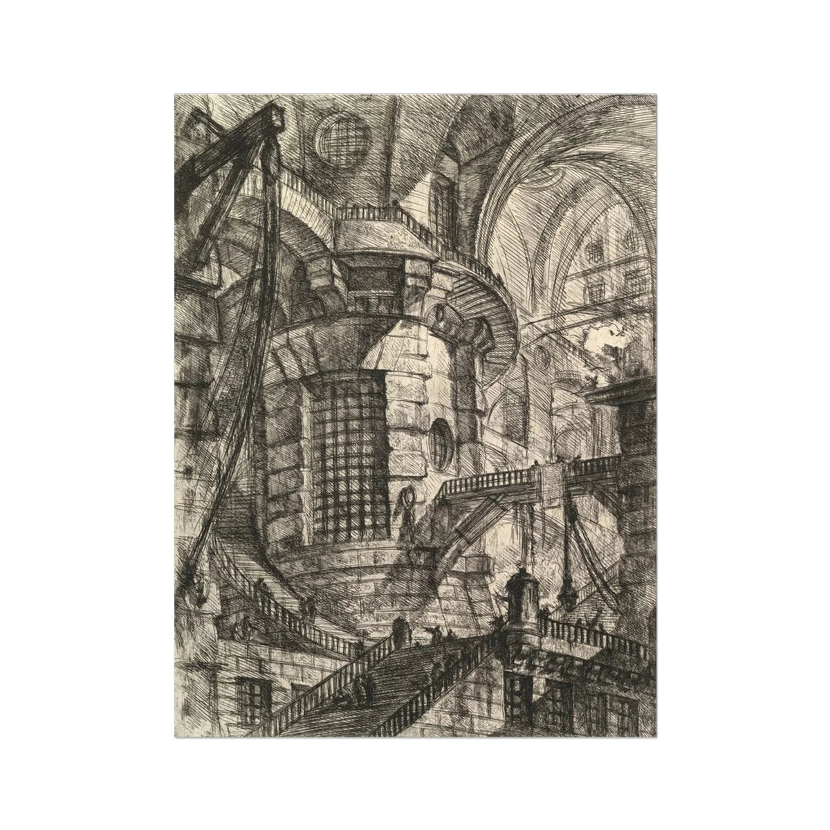 Le arcate si innalzano nell'ombra, la loro curvatura forgiata da infiniti tratteggi incrociati e inquietudine. Piranesi trascina la luce attraverso la pietra come se la ragione stessa fosse intrappolata sotto la propria invenzione.