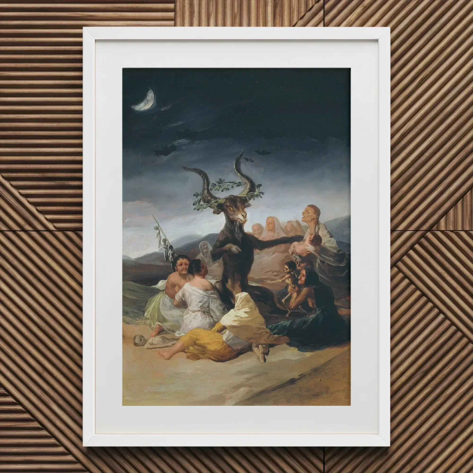 In verdi polverosi e marroni intensi, Goya distilla l'ironia dell'Illuminismo nella forma più pura dell'orrore. Le streghe si accalcano intorno al loro idolo, non come demoni ma come vittime dell'illusione, la loro fede inacidita da secoli di controllo. Un neonato pende come una profezia di corruzione.