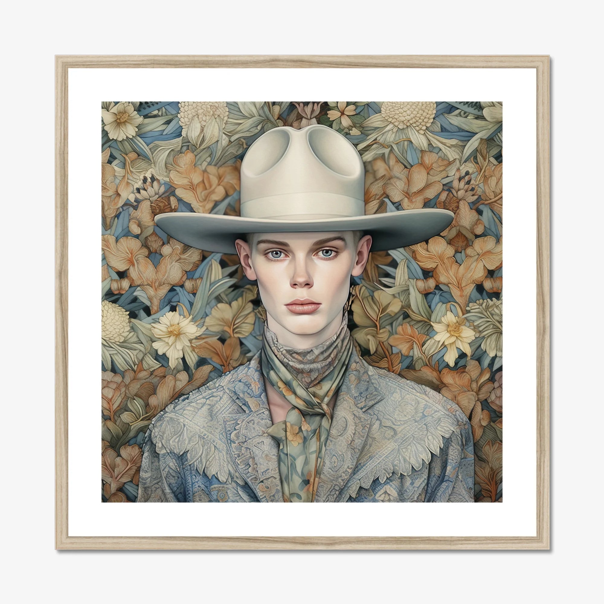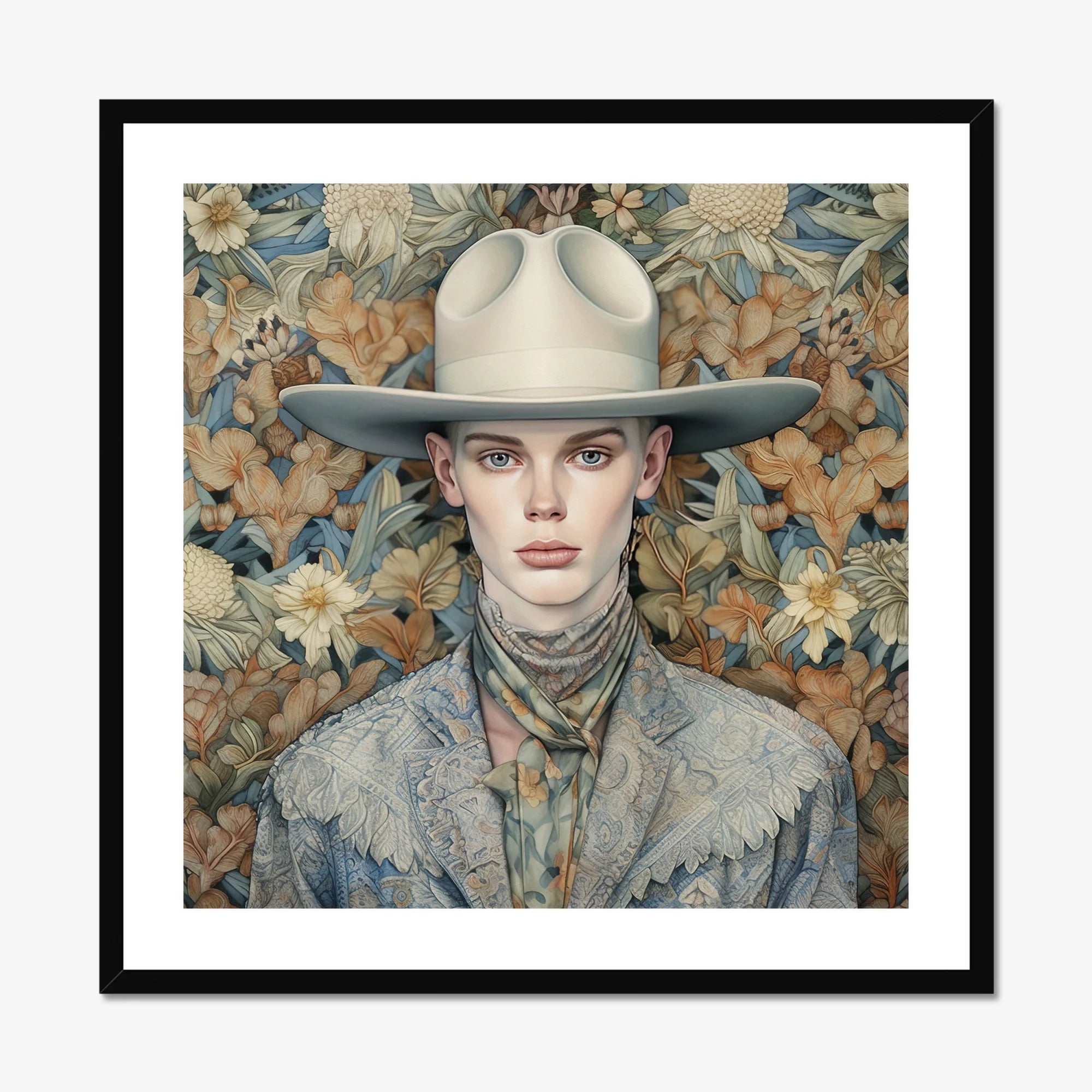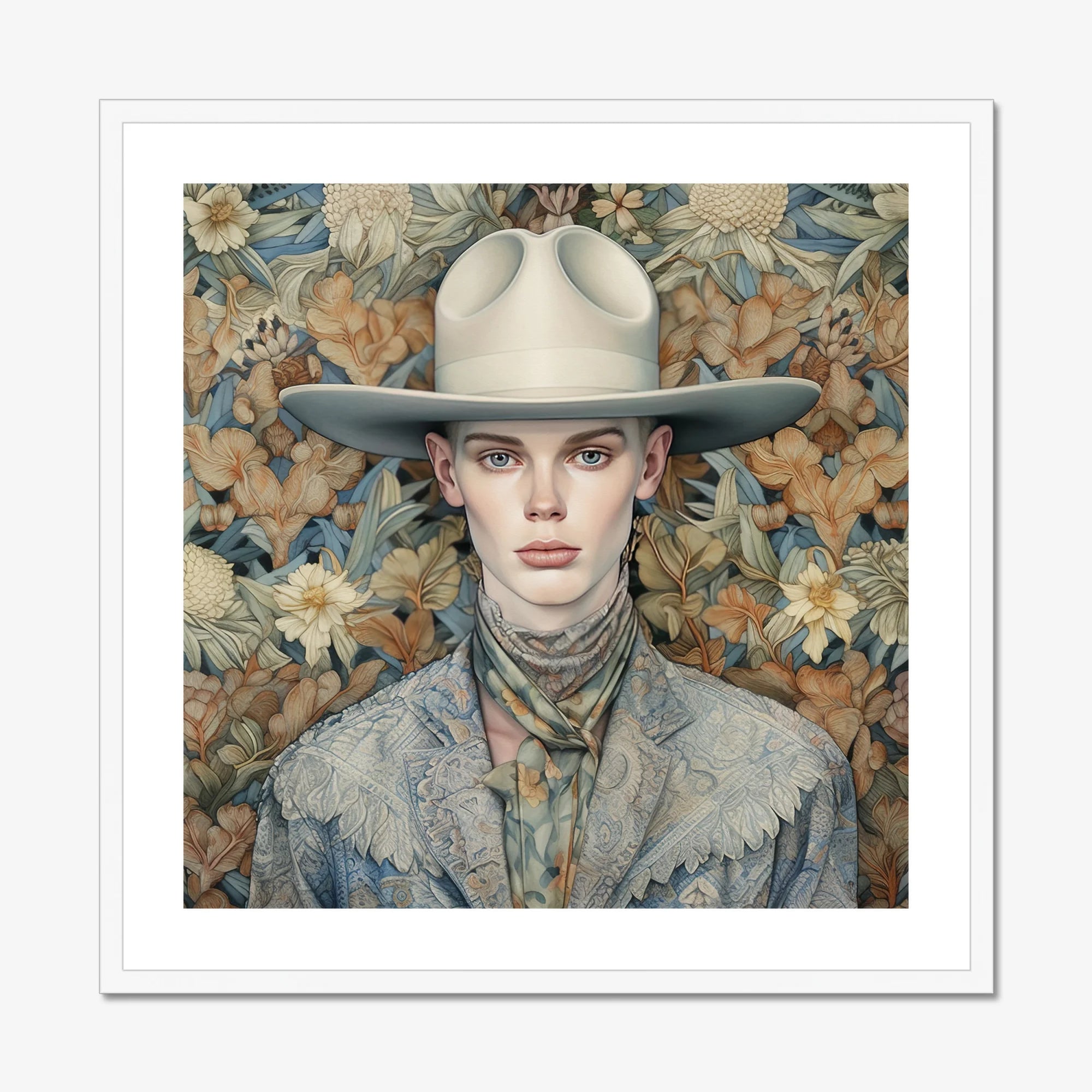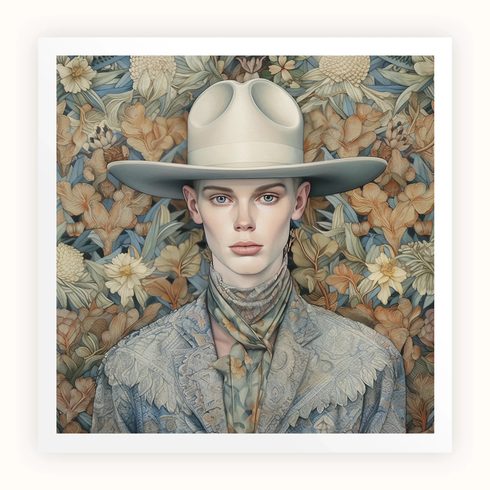 Jasper non è solo un ritratto; è una rivendicazione. Un cowboy floreale che cavalca la linea tra l'eleganza camp di alto livello e la ribellione bruciata dal sole. Il pistolero scintillante, il frontiersman dandy, il fuorilegge dalle mani morbide con un cuore pieno di rose selvatiche—la sua storia non finisce in esilio ma in trionfo, dipinta su tela, incorniciata in oro, e appesa come una dichiarazione: siamo sempre stati qui.