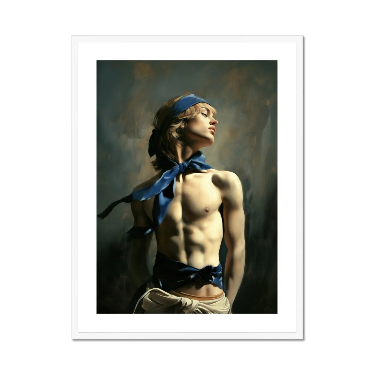 Senti il peso del desiderio, anima avventurosa — una visione di giovanile vigore gay immersa in un bagliore dorato. Il tuo nuovo femboy preferito marinaio guarda verso il cielo con passione sfrenata. Baciato dal sole e scompigliato dal vento, il suo bandana azzurro e la fascia danzano come onde mediterranee sulla pelle bronzea. Torso scolpito scoperto, incarna lo spirito marinaro e gli ideali greco-romani. Questa è la bellezza femboy elevata a splendore mitologico.