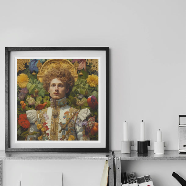 Questa stampa d'arte non è solo un ritratto ma una rivendicazione. Il principe Carlisle si erge come un testamento alla regalità gay inglese, una visione della storia queer drappeggiata in opulenza barocca, per sempre radiante, per sempre indomito.