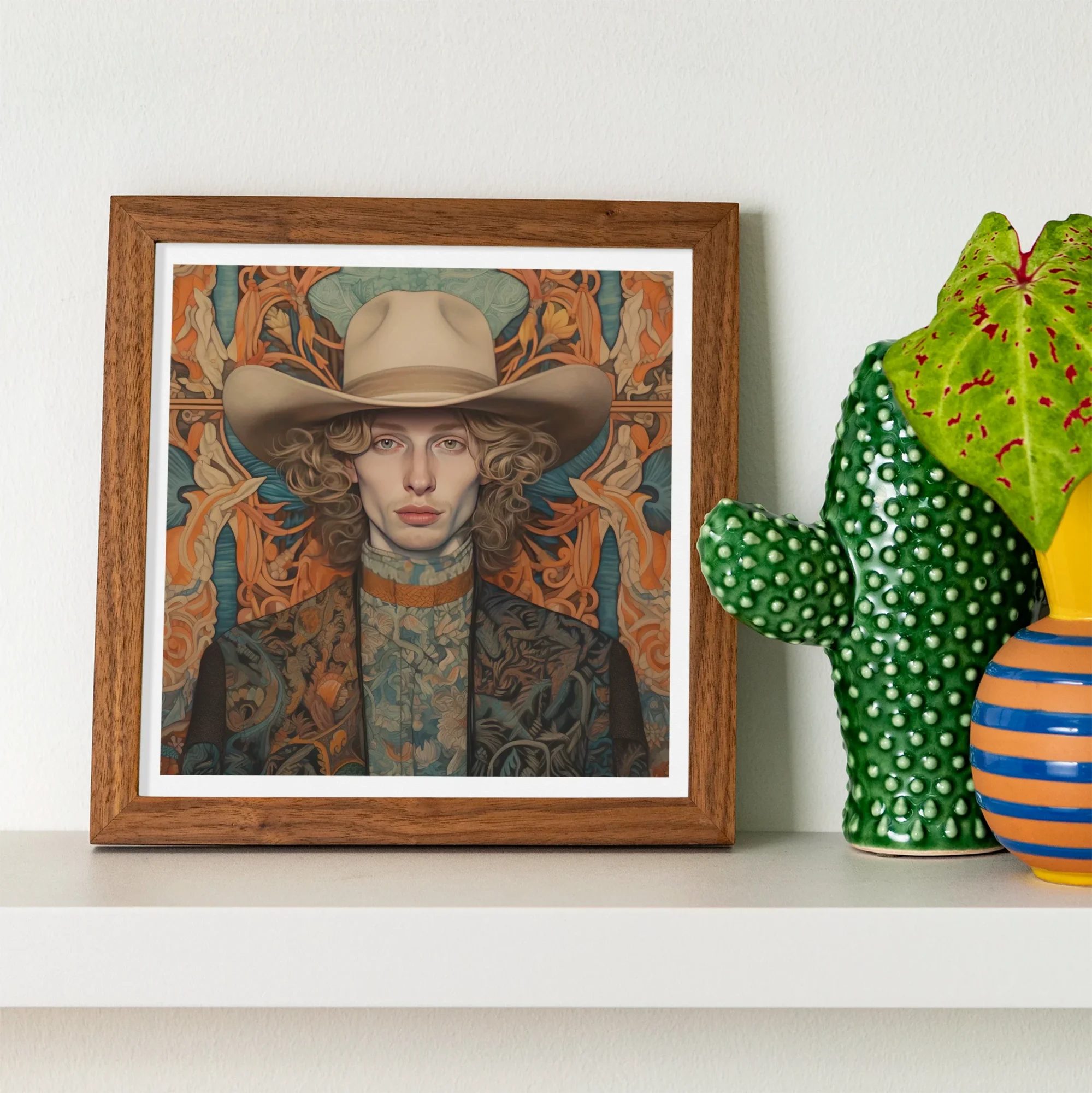 Questa stampa d'arte del cowboy gay dai capelli rossi rivendica il West americano, portando alla luce una storia in cui buckaroos androgini e dandy della frontiera vivevano, amavano e prosperavano. Qui, Reuben è sia leggenda che lettera d'amore—il suo ritratto una rivoluzione di tenerezza, il suo spirito intrecciato nell'età dell'oro del rinascimento LGBTQ+ del West. Una tela dove mascolinità, bellezza e libertà cavalcano fianco a fianco sotto un orizzonte dipinto di possibilità.