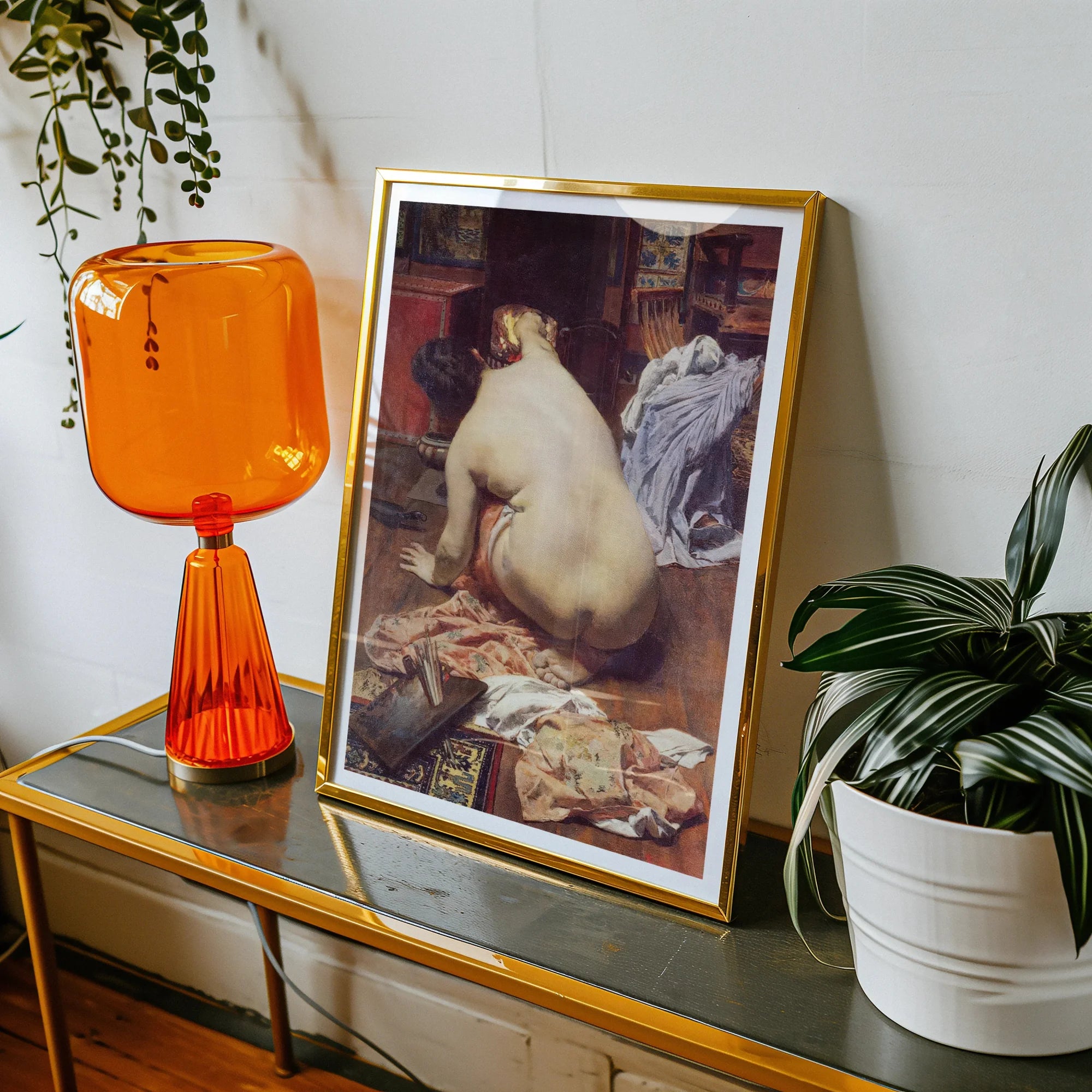 Il magistrale pennello di Cortina Farinós dà vita alla forma morbida della modella, la schiena si girava mentre si inginocchia sul pavimento di legno. Il gioco della luce attraverso la sua pelle mette in mostra l'eccezionale talento dell'artista per catturare la figura umana. Il tuo occhio vagherà sui dettagli sontuosi-mobili ornati, tappeti fantasia e scorci di piastrelle decorative-che ti trasporta in un XIX secolo spagnolo Studio dell'artista.